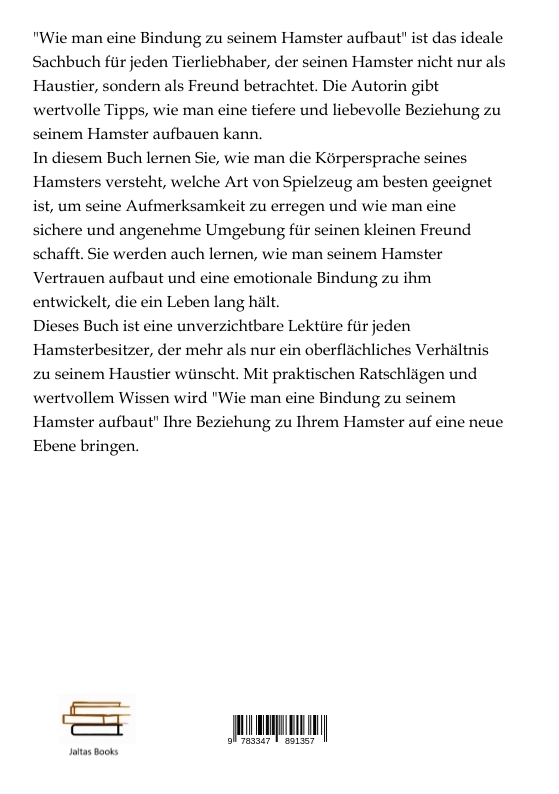 "Wie man eine Bindung zu seinem Hamster aufbaut" ist das ideale Sachbuch für jeden Tierliebhaber, der seinen Hamster nicht nur als Haustier, sondern als Freund betrachtet. Die Autorin gibt wertvolle Tipps, wie man eine tiefere und liebevolle Beziehung zu seinem Hamster aufbauen kann.In diesem Buch lernen Sie, wie man die Körpersprache seines Hamsters versteht, welche Art von Spielzeug am besten geeignet ist, um seine Aufmerksamkeit zu erregen und wie man eine sichere und angenehme Umgebung für seinen kleinen Freund schafft. Sie werden auch lernen, wie man seinem Hamster Vertrauen aufbaut und eine emotionale Bindung zu ihm entwickelt, die ein Leben lang hält.Dieses Buch ist eine unverzichtbare Lektüre für jeden Hamsterbesitzer, der mehr als nur ein oberflächliches Verhältnis zu seinem Haustier wünscht. Mit praktischen Ratschlägen und wertvollem Wissen wird "Wie man eine Bindung zu seinem Hamster aufbaut" Ihre Beziehung zu Ihrem Hamster auf eine neue Ebene bringen.
