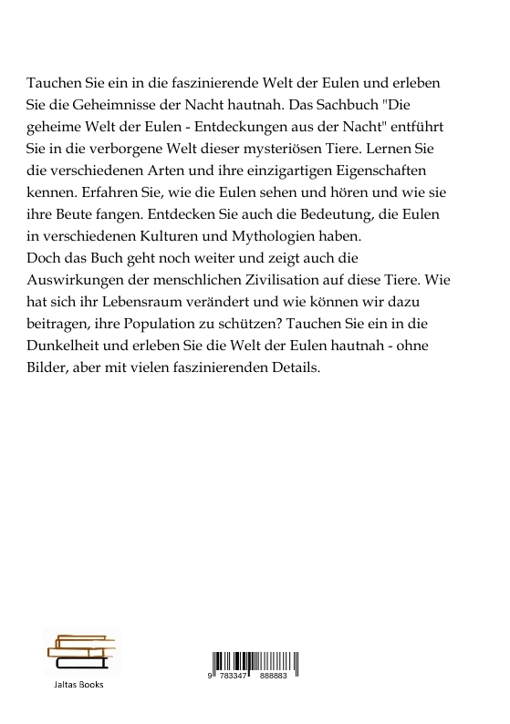 Tauchen Sie ein in die faszinierende Welt der Eulen und erleben Sie die Geheimnisse der Nacht hautnah. Das Sachbuch "Die geheime Welt der Eulen - Entdeckungen aus der Nacht" entführt Sie in die verborgene Welt dieser mysteriösen Tiere. Lernen Sie die verschiedenen Arten und ihre einzigartigen Eigenschaften kennen. Erfahren Sie, wie die Eulen sehen und hören und wie sie ihre Beute fangen. Entdecken Sie auch die Bedeutung, die Eulen in verschiedenen Kulturen und Mythologien haben.Doch das Buch geht noch weiter und zeigt auch die Auswirkungen der menschlichen Zivilisation auf diese Tiere. Wie hat sich ihr Lebensraum verändert und wie können wir dazu beitragen, ihre Population zu schützen? Tauchen Sie ein in die Dunkelheit und erleben Sie die Welt der Eulen hautnah - ohne Bilder, aber mit vielen faszinierenden Details.