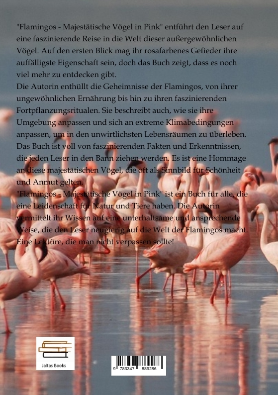 "Flamingos - Majestätische Vögel in Pink" entführt den Leser auf eine faszinierende Reise in die Welt dieser außergewöhnlichen Vögel. Auf den ersten Blick mag ihr rosafarbenes Gefieder ihre auffälligste Eigenschaft sein, doch das Buch zeigt, dass es noch viel mehr zu entdecken gibt.Die Autorin enthüllt die Geheimnisse der Flamingos, von ihrer ungewöhnlichen Ernährung bis hin zu ihren faszinierenden Fortpflanzungsritualen. Sie beschreibt auch, wie sie ihre Umgebung anpassen und sich an extreme Klimabedingungen anpassen, um in den unwirtlichsten Lebensräumen zu überleben.Das Buch ist voll von faszinierenden Fakten und Erkenntnissen, die jeden Leser in den Bann ziehen werden. Es ist eine Hommage an diese majestätischen Vögel, die oft als Sinnbild für Schönheit und Anmut gelten."Flamingos - Majestätische Vögel in Pink" ist ein Buch für alle, die eine Leidenschaft für Natur und Tiere haben. Die Autorin vermittelt ihr Wissen auf eine unterhaltsame und ansprechende Weise, die den Leser neugierig auf die Welt der Flamingos macht. Eine Lektüre, die man nicht verpassen sollte!