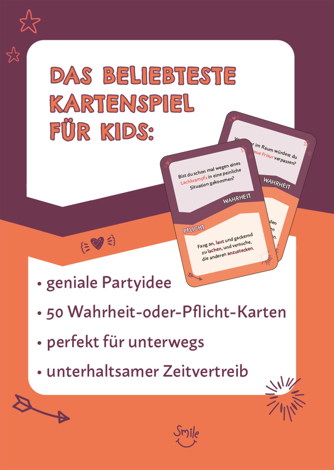 Dank des einfachen Spielprinzips ist »Wahrheit oder Pflicht « genau das richtige Kartenspiel für jede Party. Fragen wie »Welcher Star wärst du gerne?« oder Aufgaben wie »Versuch mit der Zunge deine Nasenspitze zu berühren« sind nur einige Beispiele von insgesamt 50 Wahrheit- oder Pflicht-Karten, die es zu meistern gilt.