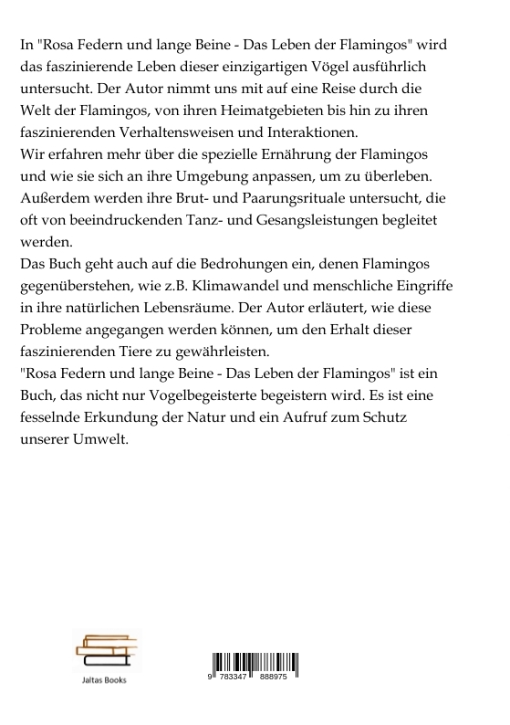 In "Rosa Federn und lange Beine - Das Leben der Flamingos" wird das faszinierende Leben dieser einzigartigen Vögel ausführlich untersucht. Der Autor nimmt uns mit auf eine Reise durch die Welt der Flamingos, von ihren Heimatgebieten bis hin zu ihren faszinierenden Verhaltensweisen und Interaktionen.Wir erfahren mehr über die spezielle Ernährung der Flamingos und wie sie sich an ihre Umgebung anpassen, um zu überleben. Außerdem werden ihre Brut- und Paarungsrituale untersucht, die oft von beeindruckenden Tanz- und Gesangsleistungen begleitet werden.Das Buch geht auch auf die Bedrohungen ein, denen Flamingos gegenüberstehen, wie z.B. Klimawandel und menschliche Eingriffe in ihre natürlichen Lebensräume. Der Autor erläutert, wie diese Probleme angegangen werden können, um den Erhalt dieser faszinierenden Tiere zu gewährleisten."Rosa Federn und lange Beine - Das Leben der Flamingos" ist ein Buch, das nicht nur Vogelbegeisterte begeistern wird. Es ist eine fesselnde Erkundung der Natur und ein Aufruf zum Schutz unserer Umwelt.