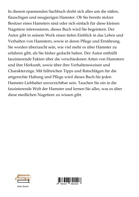 In diesem spannenden Sachbuch dreht sich alles um die süßen, flauschigen und neugierigen Hamster. Ob Sie bereits stolzer Besitzer eines Hamsters sind oder sich einfach für diese kleinen Nagetiere interessieren, dieses Buch wird Sie begeistern. Der Autor gibt in seinem Werk einen tiefen Einblick in das Leben und Verhalten von Hamstern, sowie in deren Pflege und Ernährung. Sie werden überrascht sein, wie viel mehr es über Hamster zu erfahren gibt, als Sie bisher gedacht haben. Der Autor enthüllt faszinierende Fakten über die verschiedenen Arten von Hamstern und ihre Herkunft, sowie über ihre Verhaltensweisen und Charakterzüge. Mit hilfreichen Tipps und Ratschlägen für die artgerechte Haltung und Pflege wird dieses Buch für jeden Hamster-Liebhaber unverzichtbar sein. Tauchen Sie ein in die faszinierende Welt der Hamster und lernen Sie alles, was es über diese niedlichen Nagetiere zu wissen gibt.