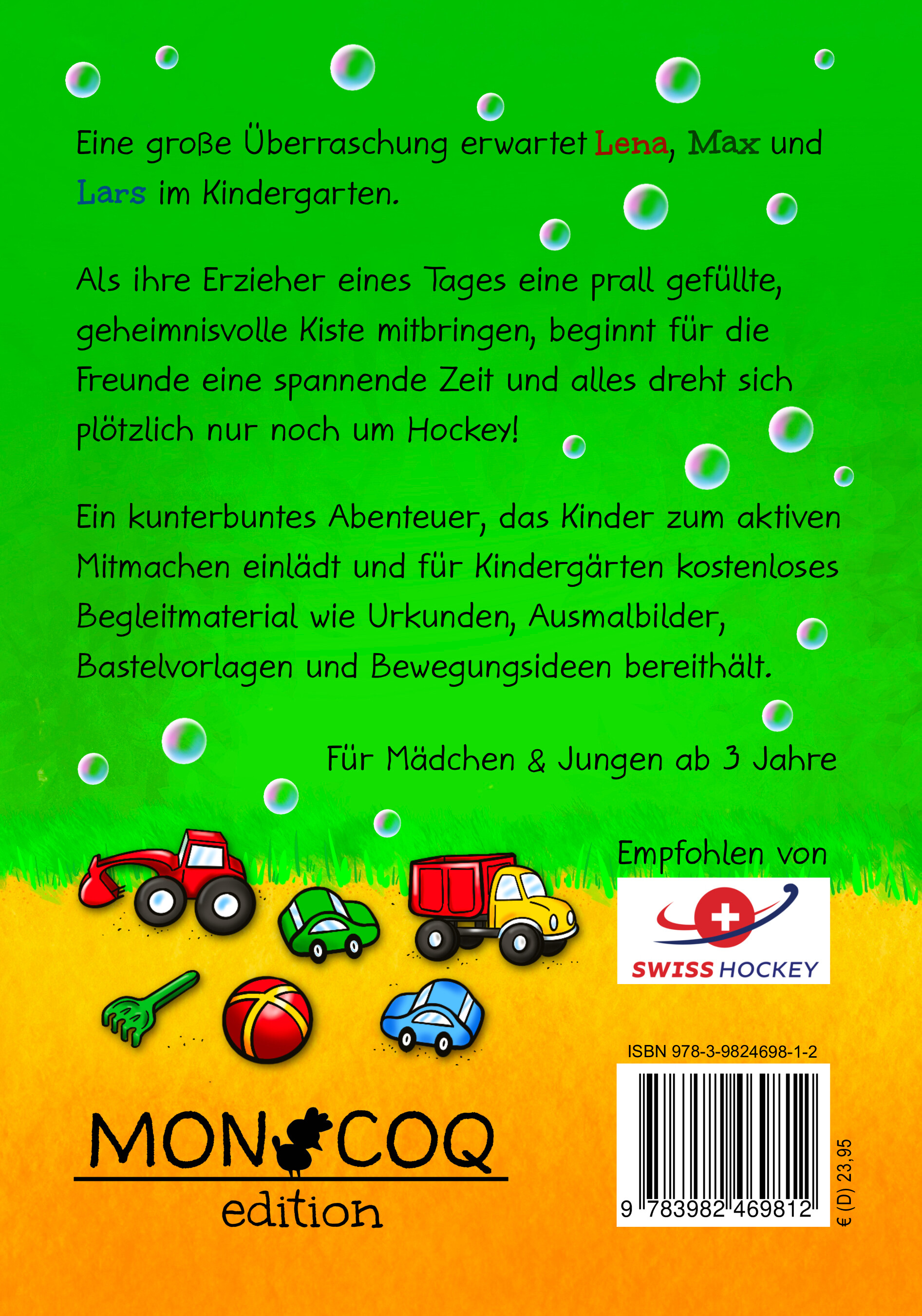Ihre Geschichte verknüpft den bekannten Kindergartenalltag der kleinen Zuhörerkinder mit etwas Neuem, einer Sportart, die sie gemeinsam und kindgerecht mit den Hauptfiguren Lena, Max und Lars kennenlernen: HOCKEY.