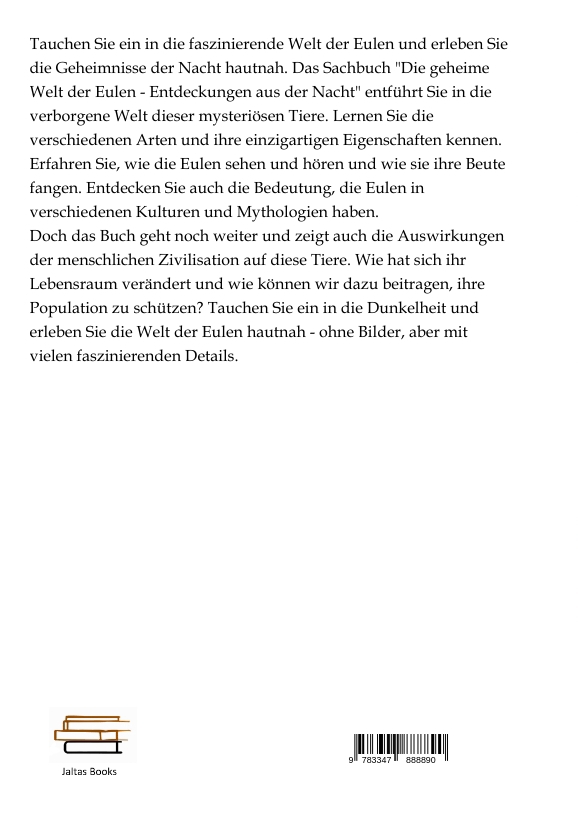 Tauchen Sie ein in die faszinierende Welt der Eulen und erleben Sie die Geheimnisse der Nacht hautnah. Das Sachbuch "Die geheime Welt der Eulen - Entdeckungen aus der Nacht" entführt Sie in die verborgene Welt dieser mysteriösen Tiere. Lernen Sie die verschiedenen Arten und ihre einzigartigen Eigenschaften kennen. Erfahren Sie, wie die Eulen sehen und hören und wie sie ihre Beute fangen. Entdecken Sie auch die Bedeutung, die Eulen in verschiedenen Kulturen und Mythologien haben.Doch das Buch geht noch weiter und zeigt auch die Auswirkungen der menschlichen Zivilisation auf diese Tiere. Wie hat sich ihr Lebensraum verändert und wie können wir dazu beitragen, ihre Population zu schützen? Tauchen Sie ein in die Dunkelheit und erleben Sie die Welt der Eulen hautnah - ohne Bilder, aber mit vielen faszinierenden Details.
