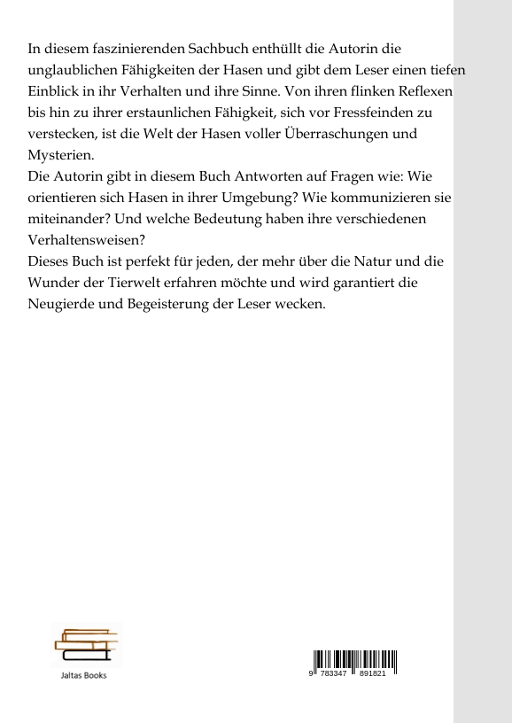 In diesem faszinierenden Sachbuch enthüllt die Autorin die unglaublichen Fähigkeiten der Hasen und gibt dem Leser einen tiefen Einblick in ihr Verhalten und ihre Sinne. Von ihren flinken Reflexen bis hin zu ihrer erstaunlichen Fähigkeit, sich vor Fressfeinden zu verstecken, ist die Welt der Hasen voller Überraschungen und Mysterien.Die Autorin gibt auf unterhaltsame und informative Weise Antworten auf Fragen wie: Wie orientieren sich Hasen in ihrer Umgebung? Wie kommunizieren sie miteinander? Und welche Bedeutung haben ihre verschiedenen Verhaltensweisen?Dieses Buch ist perfekt für jeden, der mehr über die Natur und die Wunder der Tierwelt erfahren möchte und wird garantiert die Neugierde und Begeisterung der Leser wecken.