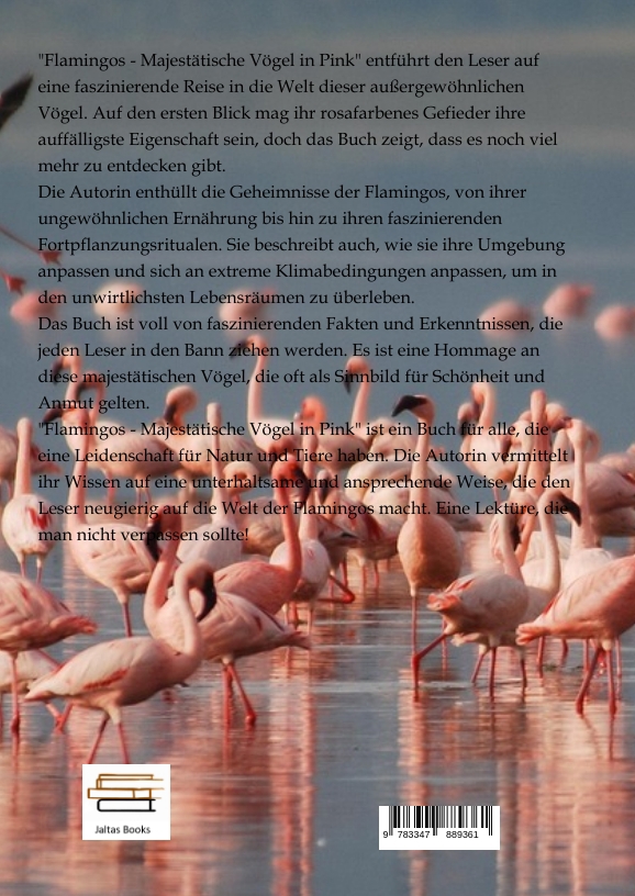 "Flamingos - Majestätische Vögel in Pink" entführt den Leser auf eine faszinierende Reise in die Welt dieser außergewöhnlichen Vögel. Auf den ersten Blick mag ihr rosafarbenes Gefieder ihre auffälligste Eigenschaft sein, doch das Buch zeigt, dass es noch viel mehr zu entdecken gibt.Die Autorin enthüllt die Geheimnisse der Flamingos, von ihrer ungewöhnlichen Ernährung bis hin zu ihren faszinierenden Fortpflanzungsritualen. Sie beschreibt auch, wie sie ihre Umgebung anpassen und sich an extreme Klimabedingungen anpassen, um in den unwirtlichsten Lebensräumen zu überleben.Das Buch ist voll von faszinierenden Fakten und Erkenntnissen, die jeden Leser in den Bann ziehen werden. Es ist eine Hommage an diese majestätischen Vögel, die oft als Sinnbild für Schönheit und Anmut gelten."Flamingos - Majestätische Vögel in Pink" ist ein Buch für alle, die eine Leidenschaft für Natur und Tiere haben. Die Autorin vermittelt ihr Wissen auf eine unterhaltsame und ansprechende Weise, die den Leser neugierig auf die Welt der Flamingos macht. Eine Lektüre, die man nicht verpassen sollte!