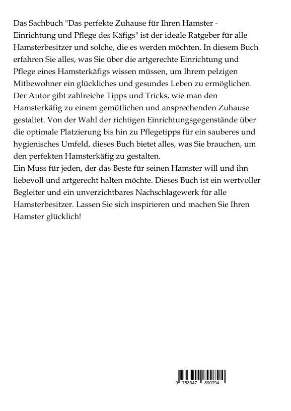 Das Sachbuch "Das perfekte Zuhause für Ihren Hamster - Einrichtung und Pflege des Käfigs" ist der ideale Ratgeber für alle Hamsterbesitzer und solche, die es werden möchten. In diesem Buch erfahren Sie alles, was Sie über die artgerechte Einrichtung und Pflege eines Hamsterkäfigs wissen müssen, um Ihrem pelzigen Mitbewohner ein glückliches und gesundes Leben zu ermöglichen.Der Autor gibt zahlreiche Tipps und Tricks, wie man den Hamsterkäfig zu einem gemütlichen und ansprechenden Zuhause gestaltet. Von der Wahl der richtigen Einrichtungsgegenstände über die optimale Platzierung bis hin zu Pflegetipps für ein sauberes und hygienisches Umfeld, dieses Buch bietet alles, was Sie brauchen, um den perfekten Hamsterkäfig zu gestalten.Ein Muss für jeden, der das Beste für seinen Hamster will und ihn liebevoll und artgerecht halten möchte. Dieses Buch ist ein wertvoller Begleiter und ein unverzichtbares Nachschlagewerk für alle Hamsterbesitzer. Lassen Sie sich inspirieren und machen Sie Ihren Hamster glücklich!