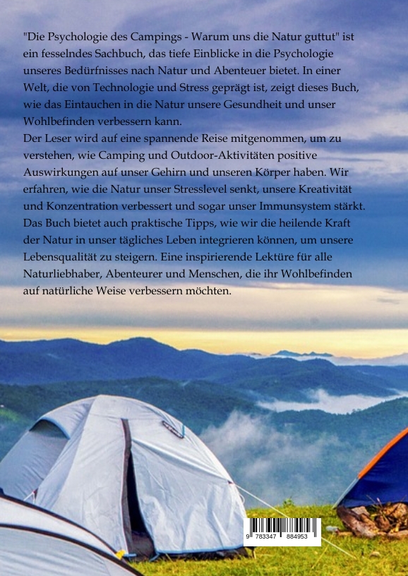 "Die Psychologie des Campings - Warum uns die Natur guttut" ist ein fesselndes Sachbuch, das tiefe Einblicke in die Psychologie unseres Bedürfnisses nach Natur und Abenteuer bietet. In einer Welt, die von Technologie und Stress geprägt ist, zeigt dieses Buch, wie das Eintauchen in die Natur unsere Gesundheit und unser Wohlbefinden verbessern kann.Der Leser wird auf eine spannende Reise mitgenommen, um zu verstehen, wie Camping und Outdoor-Aktivitäten positive Auswirkungen auf unser Gehirn und unseren Körper haben. Wir erfahren, wie die Natur unser Stresslevel senkt, unsere Kreativität und Konzentration verbessert und sogar unser Immunsystem stärkt.Das Buch bietet auch praktische Tipps, wie wir die heilende Kraft der Natur in unser tägliches Leben integrieren können, um unsere Lebensqualität zu steigern. Eine inspirierende Lektüre für alle Naturliebhaber, Abenteurer und Menschen, die ihr Wohlbefinden auf natürliche Weise verbessern möchten.
