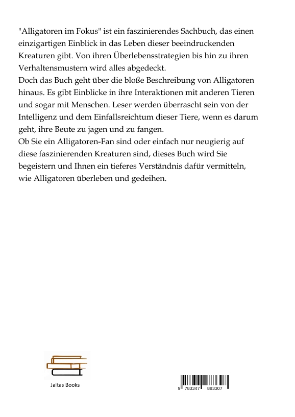 "Alligatoren im Fokus" ist ein faszinierendes Sachbuch, das einen einzigartigen Einblick in das Leben dieser beeindruckenden Kreaturen gibt. Von ihren Überlebensstrategien bis hin zu ihren Verhaltensmustern wird alles abgedeckt.Doch das Buch geht über die bloße Beschreibung von Alligatoren hinaus. Es gibt Einblicke in ihre Interaktionen mit anderen Tieren und sogar mit Menschen. Leser werden überrascht sein von der Intelligenz und dem Einfallsreichtum dieser Tiere, wenn es darum geht, ihre Beute zu jagen und zu fangen.Ob Sie ein Alligatoren-Fan sind oder einfach nur neugierig auf diese faszinierenden Kreaturen sind, dieses Buch wird Sie begeistern und Ihnen ein tieferes Verständnis dafür vermitteln, wie Alligatoren überleben und gedeihen.