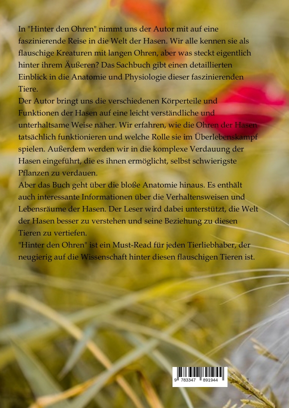 In "Hinter den Ohren" nimmt uns der Autor mit auf eine faszinierende Reise in die Welt der Hasen. Wir alle kennen sie als flauschige Kreaturen mit langen Ohren, aber was steckt eigentlich hinter ihrem Äußeren? Das Sachbuch gibt einen detaillierten Einblick in die Anatomie und Physiologie dieser faszinierenden Tiere.Der Autor bringt uns die verschiedenen Körperteile und Funktionen der Hasen auf eine leicht verständliche und unterhaltsame Weise näher. Wir erfahren, wie die Ohren der Hasen tatsächlich funktionieren und welche Rolle sie im Überlebenskampf spielen. Außerdem werden wir in die komplexe Verdauung der Hasen eingeführt, die es ihnen ermöglicht, selbst schwierigste Pflanzen zu verdauen.Aber das Buch geht über die bloße Anatomie hinaus. Es enthält auch interessante Informationen über die Verhaltensweisen und Lebensräume der Hasen. Der Leser wird dabei unterstützt, die Welt der Hasen besser zu verstehen und seine Beziehung zu diesen Tieren zu vertiefen."Hinter den Ohren" ist ein Must-Read für jeden Tierliebhaber, der neugierig auf die Wissenschaft hinter diesen flauschigen Tieren ist.