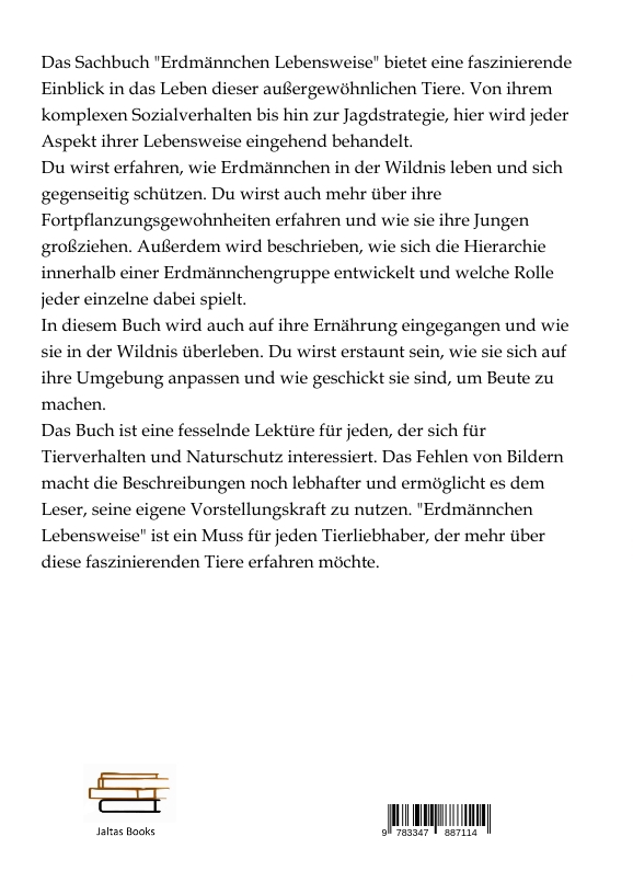 Das Sachbuch "Erdmännchen Lebensweise" bietet eine faszinierende Einblick in das Leben dieser außergewöhnlichen Tiere. Von ihrem komplexen Sozialverhalten bis hin zur Jagdstrategie, hier wird jeder Aspekt ihrer Lebensweise eingehend behandelt.Du wirst erfahren, wie Erdmännchen in der Wildnis leben und sich gegenseitig schützen. Du wirst auch mehr über ihre Fortpflanzungsgewohnheiten erfahren und wie sie ihre Jungen großziehen. Außerdem wird beschrieben, wie sich die Hierarchie innerhalb einer Erdmännchengruppe entwickelt und welche Rolle jeder einzelne dabei spielt.In diesem Buch wird auch auf ihre Ernährung eingegangen und wie sie in der Wildnis überleben. Du wirst erstaunt sein, wie sie sich auf ihre Umgebung anpassen und wie geschickt sie sind, um Beute zu machen.Das Buch ist eine fesselnde Lektüre für jeden, der sich für Tierverhalten und Naturschutz interessiert. Das Fehlen von Bildern macht die Beschreibungen noch lebhafter und ermöglicht es dem Leser, seine eigene Vorstellungskraft zu nutzen. "Erdmännchen Lebensweise" ist ein Muss für jeden Tierliebhaber, der mehr über diese faszinierenden Tiere erfahren möchte.