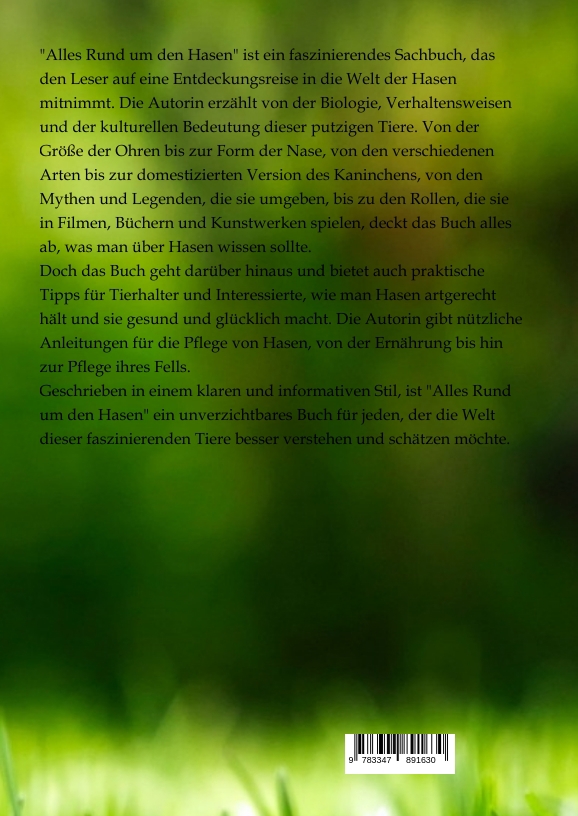 "Alles Rund um den Hasen" ist ein faszinierendes Sachbuch, das den Leser auf eine Entdeckungsreise in die Welt der Hasen mitnimmt. Die Autorin erzählt von der Biologie, Verhaltensweisen und der kulturellen Bedeutung dieser putzigen Tiere. Von der Größe der Ohren bis zur Form der Nase, von den verschiedenen Arten bis zur domestizierten Version des Kaninchens, von den Mythen und Legenden, die sie umgeben, bis zu den Rollen, die sie in Filmen, Büchern und Kunstwerken spielen, deckt das Buch alles ab, was man über Hasen wissen sollte.Doch das Buch geht darüber hinaus und bietet auch praktische Tipps für Tierhalter und Interessierte, wie man Hasen artgerecht hält und sie gesund und glücklich macht. Die Autorin gibt nützliche Anleitungen für die Pflege von Hasen, von der Ernährung bis hin zur Pflege ihres Fells.Geschrieben in einem klaren und informativen Stil, ist "Alles Rund um den Hasen" ein unverzichtbares Buch für jeden, der die Welt dieser faszinierenden Tiere besser verstehen und schätzen möchte.