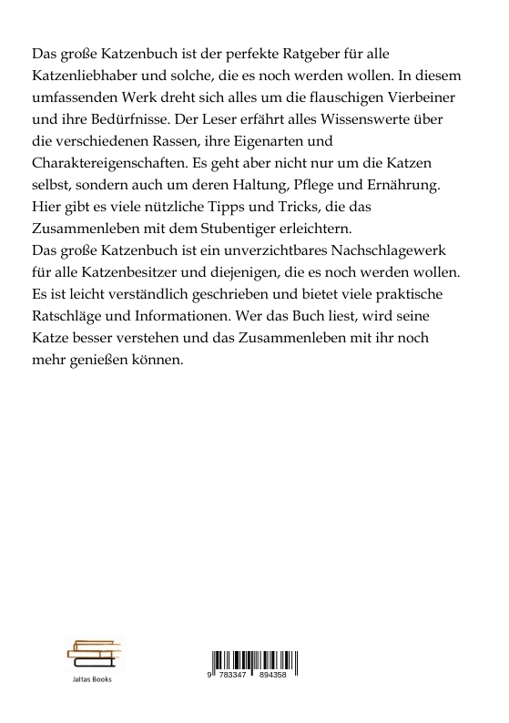 Das große Katzenbuch ist der perfekte Ratgeber für alle Katzenliebhaber und solche, die es noch werden wollen. In diesem umfassenden Werk dreht sich alles um die flauschigen Vierbeiner und ihre Bedürfnisse. Der Leser erfährt alles Wissenswerte über die verschiedenen Rassen, ihre Eigenarten und Charaktereigenschaften. Es geht aber nicht nur um die Katzen selbst, sondern auch um deren Haltung, Pflege und Ernährung. Hier gibt es viele nützliche Tipps und Tricks, die das Zusammenleben mit dem Stubentiger erleichtern.Das große Katzenbuch ist ein unverzichtbares Nachschlagewerk für alle Katzenbesitzer und diejenigen, die es noch werden wollen. Es ist leicht verständlich geschrieben und bietet viele praktische Ratschläge und Informationen. Wer das Buch liest, wird seine Katze besser verstehen und das Zusammenleben mit ihr noch mehr genießen können.