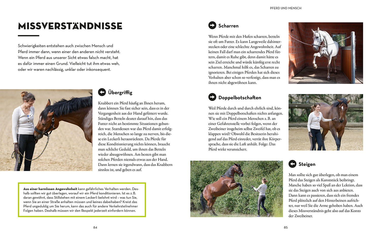 Im Verständnis von Mimik und Verhalten kommen Reiter und Pferde oft nicht auf einen Nenner, was die Harmonie in der Beziehung zwischen Mensch und Tier negativ beeinflusen kann. Was bedeuten gespitzte Ohren, ein hoch erhobener Kopf oder ein aufgestellter Schweif? Und weshalb versteht das Pferd selbst scheinbar einfache Signale nicht? Dieser umfangreich bebilderte Foto-Ratgeber erklärt anhand kurzer, prägnanter Texte, wie Pferde untereinander und mit dem Menschen kommunizieren. Er gibt Hilfestellungen zur Interpretation selbst feinster Signale und zeigt, wie Pferdehalter richtig auf die Botschaften ihres Pferdes reagieren.