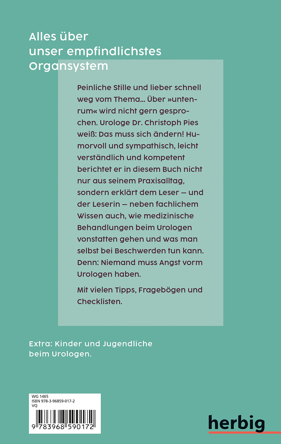 Peinliche Stille und lieber schnell weg vom Thema... Über "untenrum" wird nicht gern gesprochen. Das hat Dr. Christoph Pies selbst nur allzu oft in seiner Praxis erlebt. Er weiß: Das muss sich ändern! Mit diesem Buch sagt er dem Schweigen den Kampf an. Humorvoll und sympathisch, leicht verständlich und mit größter Kompetenz berichtet er nicht nur aus seinem Praxisalltag, sondern erklärt dem Leser - und der Leserin - neben fachlichem Wissen auch, wie medizinische Behandlungen beim Urologen vonstatten gehen. Denn: Niemand muss Angst vorm Urologen haben.