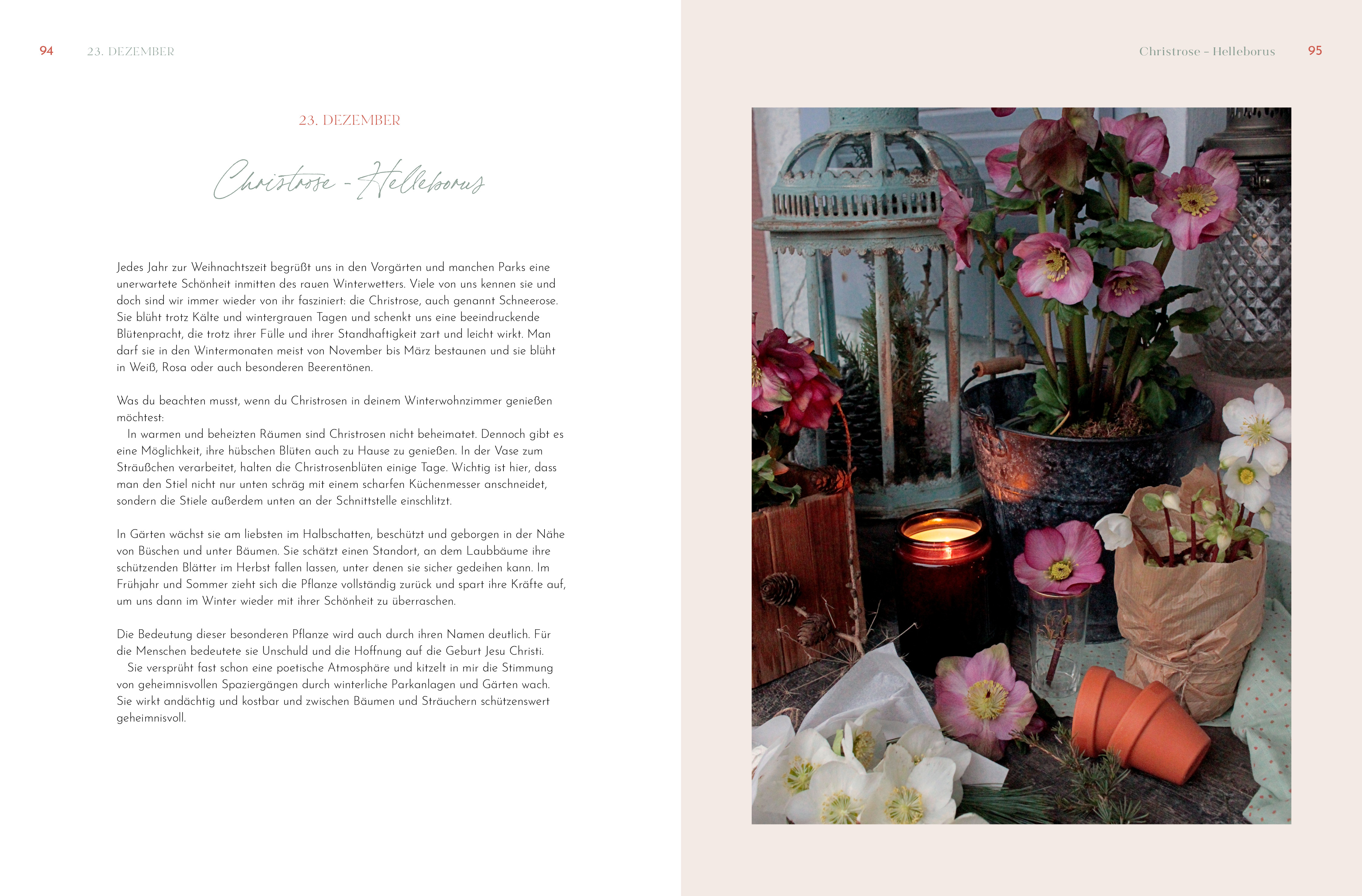 Floristin und Autorin Anna C. Rupp lässt mit ihrem Buch »Weihnachtlichen Blumenpoesie« diese tägliche Vorfreude auch für Erwachsene wieder auferstehen. Das jährlich wiederverwendbare Ideenbuch startet zur Einstimmung bereits Ende November und endet für einen ruhigen Ausklang erst mit den Rauhnächten im Januar. Im Mittelpunkt: Die Welt der Winterblumen und der Pflanzen für die Weihnachtszeit.