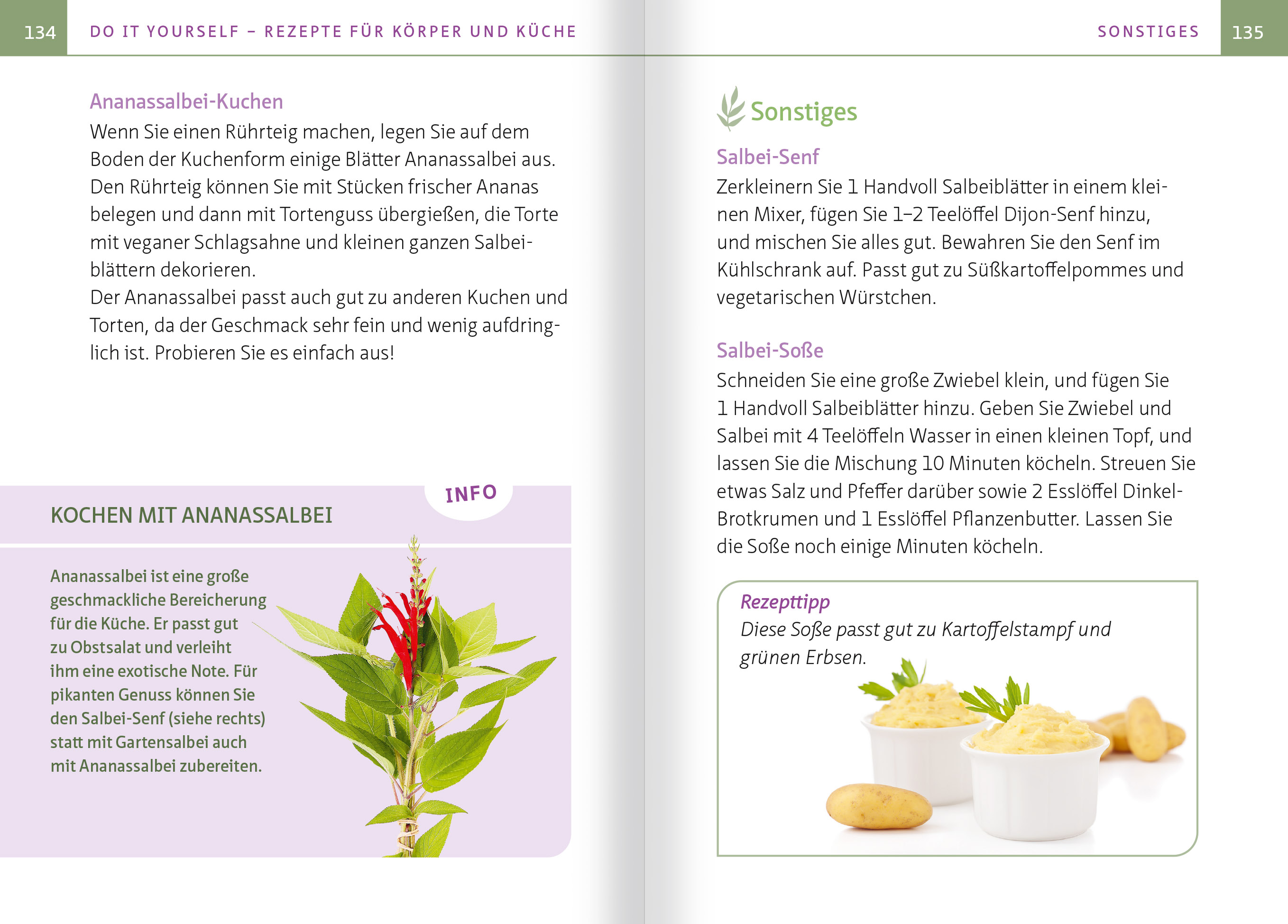 INHALTVorwortSALBEI, EINE SCHILLERNDE HEILPFLANZEZur Geschichte des SalbeisDer Salbei in der VolksmedizinZur mystischen BedeutungRund um die BotanikWeitere SalbeisortenHeilkräftige Verwandte des GartensalbeisSalbeianbau zu HauseDie ErnteEXTRA: Salbei in der LandwirtschaftEIN WAHRER MEDIZINSCHRANK DER NATURWertvolle Inhaltsstoffe- Vitamine und Mineralstoffe- Bioaktive SubstanzenWirkung auf Körper und Geist- Aktiv gegen Viren, Pilze und Bakterien- Hilfe bei Entzündungen- Prophylaxe für Herz-Kreislauf-Erkrankungen- Starke Hilfe gegen den Diabetes- Gesund für Nerven und Gehirn- KrebsprophylaxeHeilanwendungen bei häufigen Beschwerden- Akne- Alzheimer/Demenz- Angina pectoris- Aphthen- Appetit- Asthma- Blähungen- Blut- Blutdruck, hoher- Blutdruck, niedriger- Blutergüsse- Bronchitis- Burn-out- Depressionen- Diabetes mellitus- Durchfall/Reizdarm- Entzündungen- Erkältung/grippaler Infekt- Frostbeulen- Furunkel- Fußpilz- Gallenblasenentzündung- Gedächtnisschwäche- Halsschmerzen- Hauterkrankungen- Hirnleistungsstörungen- Husten- Insektenstiche- Kopfschmerzen- Laryngitis- Libidoverlust- Lippenherpes- Mandelentzündung- Menstruationsbeschwerden- Morbus Parkinson- Mundfäule (Stomatitis)- Mundgeruch- Nagelbettentzündung- Nerven- Prämenstruelles Syndrom- Schweißbildung - Stress- Venenerkrankungen- Verbrennungen- Verdauungsstörungen- Wechseljahresbeschwerden- Wunden und Schnitte- Zahnen- ZahnfleischentzündungEXTRA: Besteht die Gefahr der Überdosierung?DO IT YOURSELF - REZEPTE FÜR KÖRPER UND KÜCHEHeil- und Schönheitsmittel selbst herstellen- Verschiedene Salbeiprodukte- Für Haut und HaarRezepte für leckere Gerichte- Frühstück- Suppe und Salate- Hauptgerichte- Süße Sünden- Sonstiges- GetränkeEin Wort zum SchlussAnhangKontaktLiteraturhinweiseEndnotenRegister + Rezeptregister