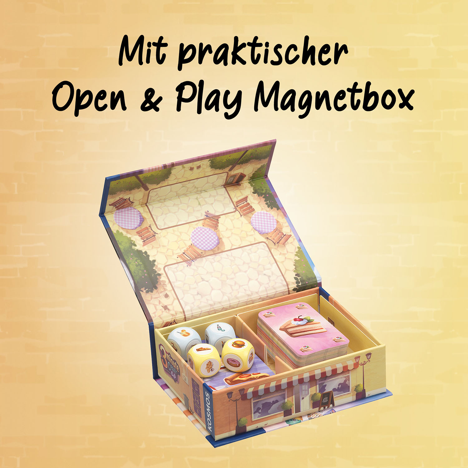 Kooperatives Echtzeitspiel für 2-6 Spielerinnen und Spieler ab 7 Jahren. Gemeinsam geschickt Würfel und Handkarten einsetzen und die Gäste im Crazy Café bewirten. Kurze Regeln, schneller Spielspaß. Variierende Schwierigkeitsstufen für einen schnellen Einstieg und langanhaltenden Spielspaß. Hochwertige Open & Play-Magnetbox - ideal als Geschenk oder für unterwegs! Schnell, da kommt schon die nächste Bestellung! Gäste bewirten und dabei immer den Überblick behalten - im Crazy Café! Nur drei Minuten bleiben den zwei bis sechs Spielerinnen und Spielern ab sieben Jahren, um gemeinsam die Gerichte und Getränke zu servieren und die Rechnung an den Tisch zu bringen. Unter Zeitdruck setzen sie geschickt Handkarten und Würfel ein. Welche Karte passt wo am besten? Sind alle Gäste wirklich satt? Schnelle Absprachen sind nötig um die Aufträge zu erfüllen. Steigende Schwierigkeitsstufen sorgen in diesem kooperativen Spiel in der praktischen Open & Play-Magnetbox für noch mehr Action - bis zur letzten Bestellung.