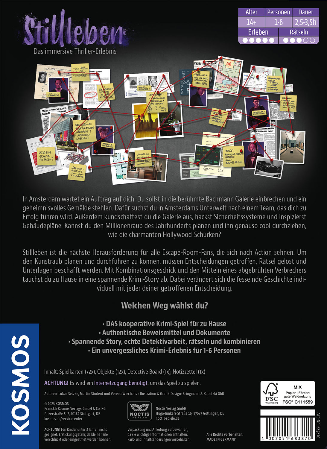Erlebt das story basierte, immersive Krimi-Spielerlebnis. Kooperativ Entscheidungen treffen, Rätsel lösen und Beweise sichten Ein Mord - zahlreiche Möglichkeiten - Welchen Weg werdet ihr wählen? Interaktive Website, Google und digitale Features unterstützen beim Lösen des Falls. Seid Teil eines erfolgreichen Kunstdiebstahls und brecht gemeinsam in eine Galerie ein. Entdeckt noch mehr aus der Brettspiel-Reihe Masters of Crime. Für 1-6 Spielerinnen und Spieler ab 14 Jahren. Geheim-Auftrag für kriminelle Masterminds! Im Team aus ein bis sechs Spielerinnen und Spielern plant ihr den Einbruch in die Amsterdamer Bachmann Galerie, um ein berühmtes Gemälde zu stehlen. Doch davor müssen Räume untersucht werden, Sicherheitssysteme gehackt und Rätsel gelöst werden. Es gibt viele Möglichkeiten, ein Meisterwerk zu stehlen. Für welche werdet ihr euch entscheiden? Der spannende Thriller verändert sich mit jeder getroffenen Entscheidung. Neben dem Spielmaterial ist auch das Internet ein wichtiger Teil des Spiels: Google Maps, extra Websites und clevere Internetrecherche helfen bei diesem spannenden Abenteuer in Amsterdam. Das interaktive Krimi-Spiel für Zuhause.