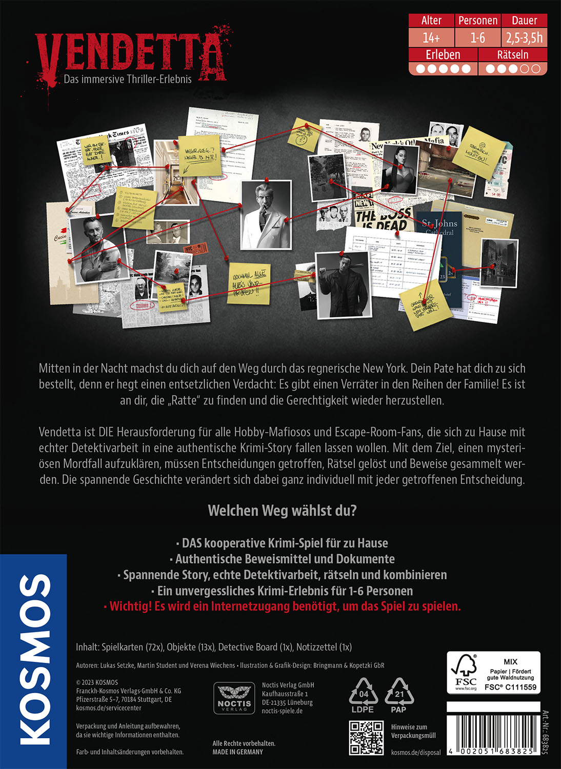 Erlebt das story-basierte, immersive Krimi-Spielerlebnis. Kooperativ Entscheidungen treffen, Rätsel lösen und Beweise sichten. Ein Mord - zahlreiche Möglichkeiten - Welchen Weg werdet ihr wählen? Interaktive Website, Google und digitale Features unterstützen beim Lösen des Falls. Ermittelt in der Mafia-Familie und findet den Verräter in den Reihen des Paten. Entdeckt noch mehr aus der Brettspiel-Reihe Masters of Crime. Für 1-6 Spielerinnen und Spieler ab 14 Jahren. Der Pate hat einen schlimmen Verdacht: Jemand aus der eigenen Familie ist ein übler Verräter! Nur wer? Eine Spurensuche in New York beginnt. Als enge Vertraute des Paten machen die ein bis sechs Spielerinnen und Spieler sich auf, herauszufinden, wer der Maulwurf in der eigenen Familie ist. Dafür sammeln sie wie Hinweise, befragen Verdächtige und lösen knifflige Rätsel. Alle Entscheidungen haben Einfluss darauf, wie sich die Geschichte weiterentwickeln wird. Neben dem umfangreichem Spielmaterial ist das Internet mit Google Maps, E-Mails und besonderen Websites Teil des Spiels. Wer ist das abtrünnige Mafia-Mitglied? Ein interaktives Krimi-Spiel für Zuhause.