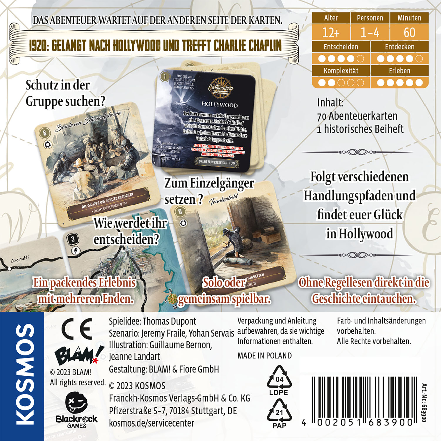 Die neue kompakte Abenteuerspielreihe für alle Fans von echten Abenteuern! Kompaktes Kartenspiel mit einfachen Regeln - ohne Regellesen - direkt in die Geschichte eintauchen. Basierend auf historischen Fakten - jedes Abenteuer wird unterstützt durch eine andere kulturelle Einrichtung. Atmosphärische historische Geschichten - von den Wikingern bis nach Hollywood. Trefft gemeinsam Entscheidungen und verfolgt den Lauf der Geschichte gemeinsam mit realen historischen Persönlichkeiten. Choose your own Adventure: mehrere mögliche Enden spielbar. Ab 12 Jahren für 1-4 Spielerinnen und Spieler. Ideal als Partyspiel, Eventspiel und als Geburtstagsgeschenk. Dank kompaktem Format ideal als kleines Geschenk, als Reisespiel und Mitbringspiel. Auf nach Hollywood! Wie im Jahr 1920 Charlie Chaplin in "Der Tramp", suchen ein bis vier Spielerinnen und Spieler ihr Glück in der Traumfabrik. Sie lassen alles hinter sich und durchqueren das Land mit einem Ziel: Genauso berühmt zu werden! Einfache Regeln führen schnell hinein ins Geschehen. Mit jeder Karte entwickelt sich die spannende Geschichte weiter: Einige Karten zeigen Orte, andere stellen die Gruppe vor wegweisende Entscheidungen. Welchen Ausgang der Geschichte werden sie wählen? Mit dem kompakten Kartenspiel den Lauf der Geschichte gemeinsam mit realen historischen Persönlichkeiten erleben.