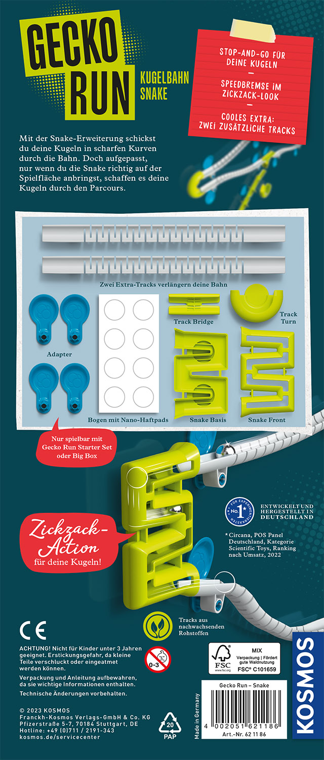 Die Kugeln schlängeln sich im Zick-Zack durch die Snake: Mit diesem Trick erhält jede Gecko Run-Bahn eine aufregende Erweiterung. Wie lange braucht die Kugel, um durch die Snake zu rollen? Schafft sie es überhaupt wieder heraus? Spannende Experimente rund um den eckigen Tunnel und den Tempowechsel warten. Zusätzliche Bahn-Elemente vergrößern die Reichweite: mit zwei Extra-Tracks und einer Brücke bietet Gecko Run noch mehr Möglichkeiten. Die perfekte Erweiterung für Gecko Run von KOSMOS, für noch rasantere Bahnen mit Zick-Zack-Spaß. Hinweis: nur mit dem Gecko Run "Starter Set" oder der "Big Box" spielbar. Wie gut schlängelt sich die Kugel durch den Zick-Zack-Kurs? Mit der Snake-Erweiterung bekommt die Gecko Run Kugelbahn ein neues, spannendes Trick-Element dazu! Schafft es die Kugel sicher wieder heraus? Und wie wirkt sich der plötzliche Tempowechsel aus? Spannende neue Fragen, die die Kinder ab acht Jahren austüfteln können! Die Anleitung gibt den ersten Kick mit Ideen für die Tricks. Das tolle Extra: Zusätzliche Bahn-Elemente vergrößern die Reichweite der KOSMOS Kugelbahn! Hinweis: nur mit dem Gecko Run "Starter Set" oder der "Big Box" spielbar.