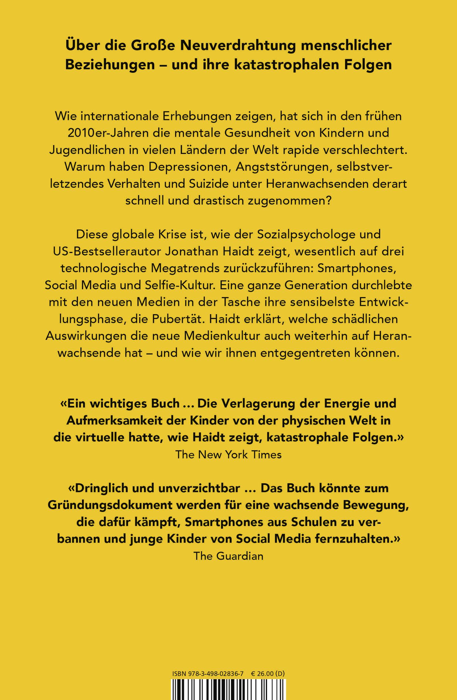 Eine Abrechnung mit unserem Smartphone-basierten modernen Lebensstil. Haidt erklärt im Detail, wie es zur Gesundheitskrise unser Kinder und Jugendlichen kommen konnte – und warum sie sich immer weiter verschärft.