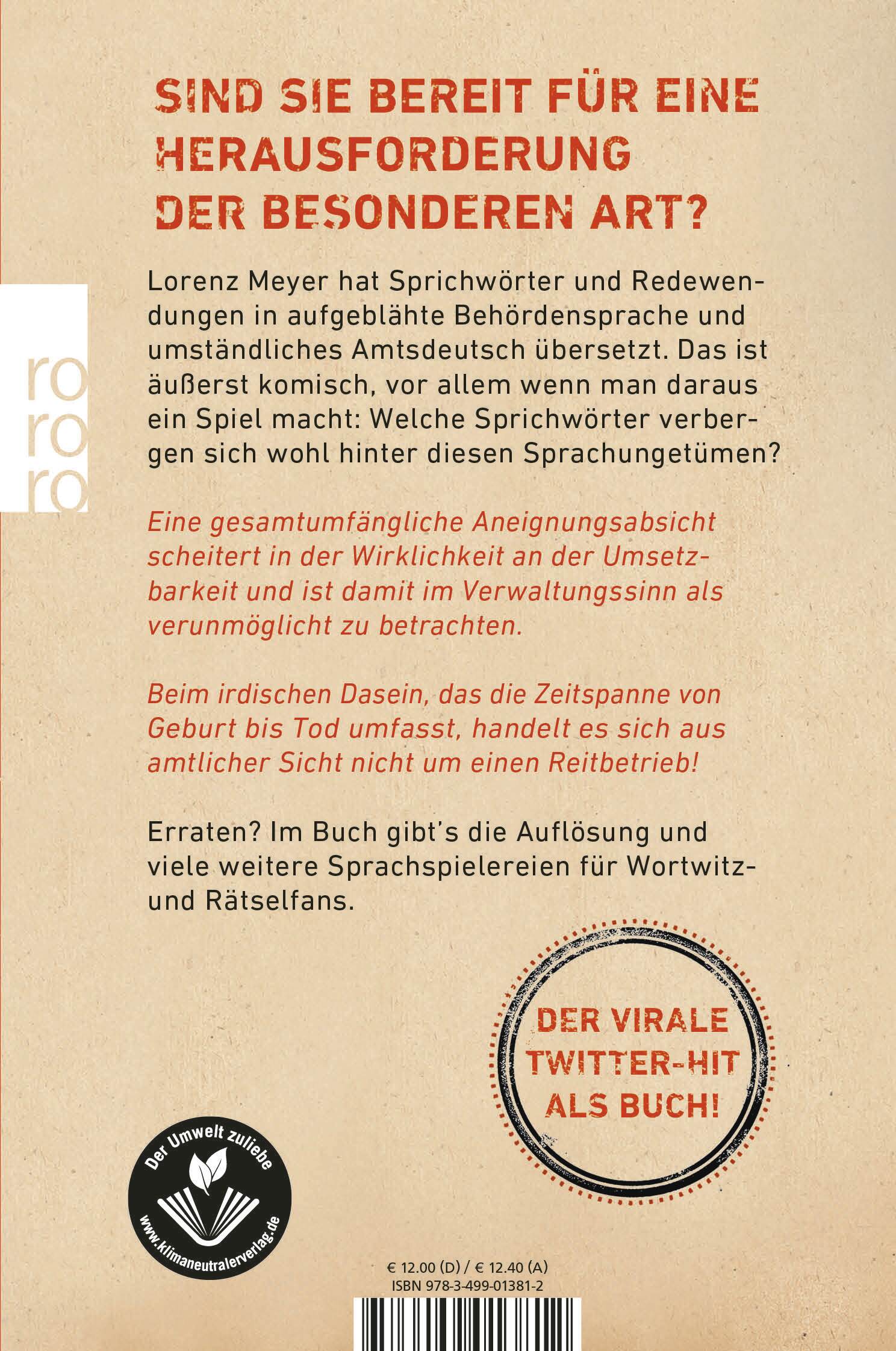 Packen Sie Ihre Denk- und Rätselfähigkeiten aus! Lorenz Meyer hat ganz normale Sprichwörter und Redewendungen in aufgeblähte Behördensprache und umständliches Amtsdeutsch übersetzt. Das ist äußerst komisch, vor allem wenn man daraus ein Spiel macht: Lesen Sie die umformulierten Sätze und raten Sie, welches Sprichwort wohl dahintersteckt. Es erwartet Sie ein amüsantes Leseerlebnis mit allerlei Bürokratensprech und Verwaltungskauderwelsch.