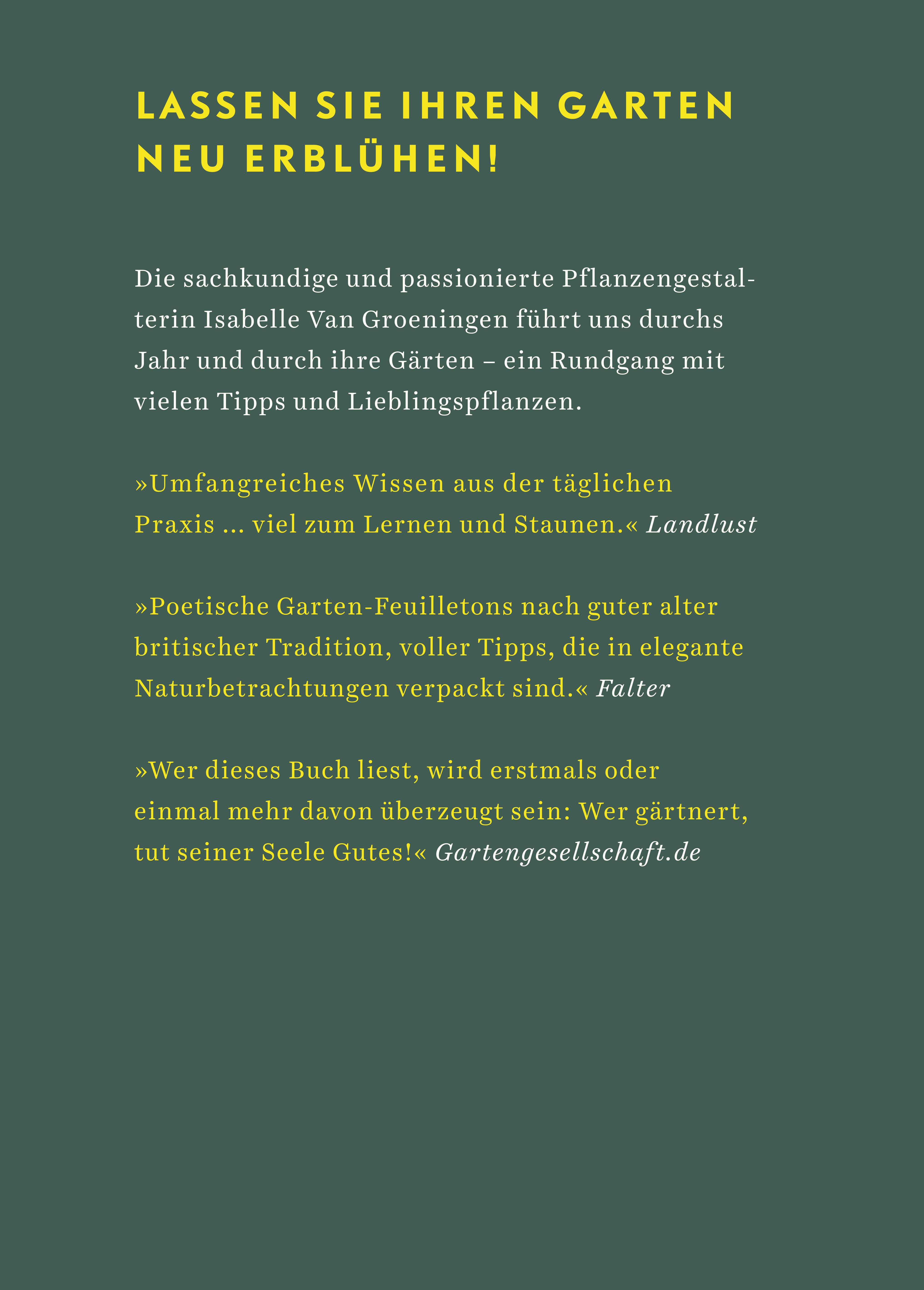 »Detailliert beschreibt [Van Groeningen], welche Gewächse in welcher Jahreszeit am besten gedeihen. ... Die Autorin weiß, wovon sie spricht ...« Manuela Talenta Lesen - Das Magazin der Buchhandlungen Orell Füssli 20220502