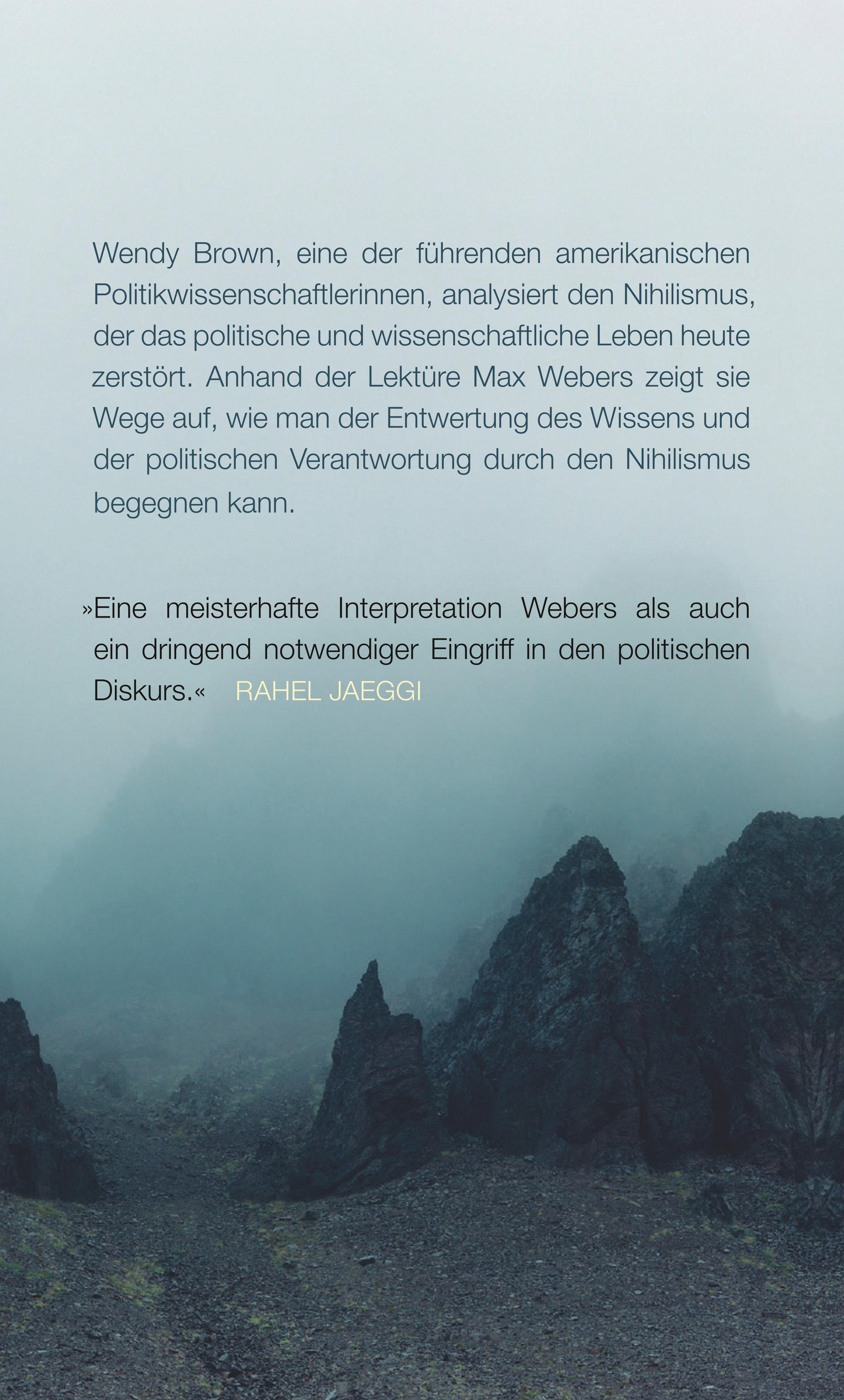 Auf der Suche nach Lösungen wendet sich Brown Max Webers berühmten Vorlesungen über Wissenschaft und Politik als Beruf zu, die dieser am Ende des Ersten Weltkriegs hielt. Darin beklagt nämlich schon Weber selbst die Auswirkungen des Nihilismus auf das wissenschaftliche und politische Leben in der Moderne und fordert eine Wiederherstellung der Wahrheit in der Wissenschaft und der Integrität in der Politik. Im Anschluss an Weber plädiert Brown dafür, das Wissen aus der Hyperpolitisierung zu befreien, und denkt über neue Wege verantwortlichen politischen Handelns nach. Vor allem aber fordert sie die Linke auf, ihrer Verpflichtung zu kritischem Denken gerecht zu werden, und entwirft eine radikaldemokratische Vision, die eine charismatische Führung nicht scheut.