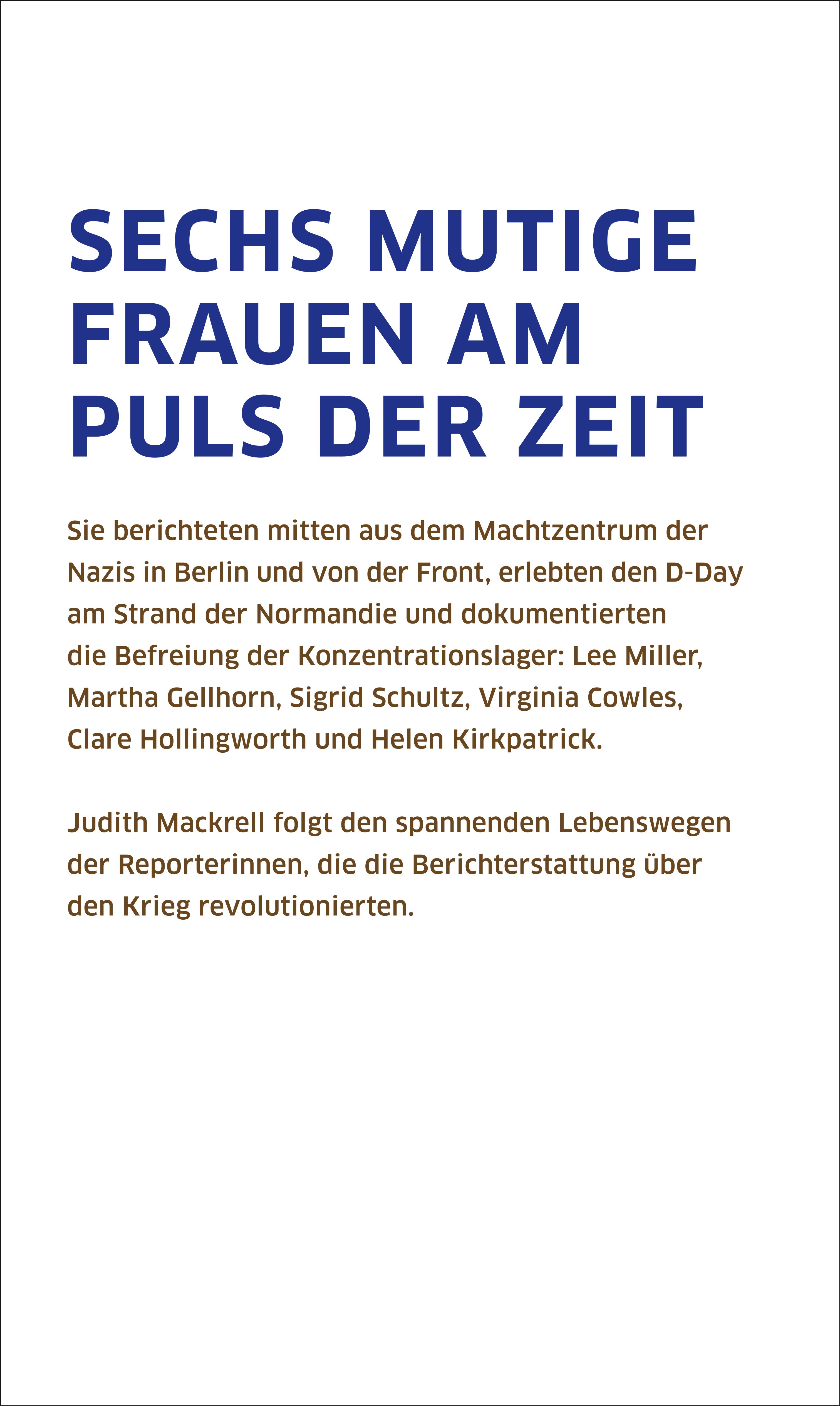 Sie berichteten unter Lebensgefahr mitten aus dem Machtzentrum der Nazis in Berlin und von der Front, erlebten den D-Day am Strand der Normandie und gehörten zu den ersten, die die Befreiung der Konzentrationslager dokumentierten. Sechs außergewöhnlichen Frauen, die die bis dahin weitgehend männliche Domäne der Kriegsberichterstattung erobert haben: Lee Miller, Martha Gellhorn, Sigrid Schultz, Virginia Cowles, Clare Hollingworth und Helen Kirkpatrick
