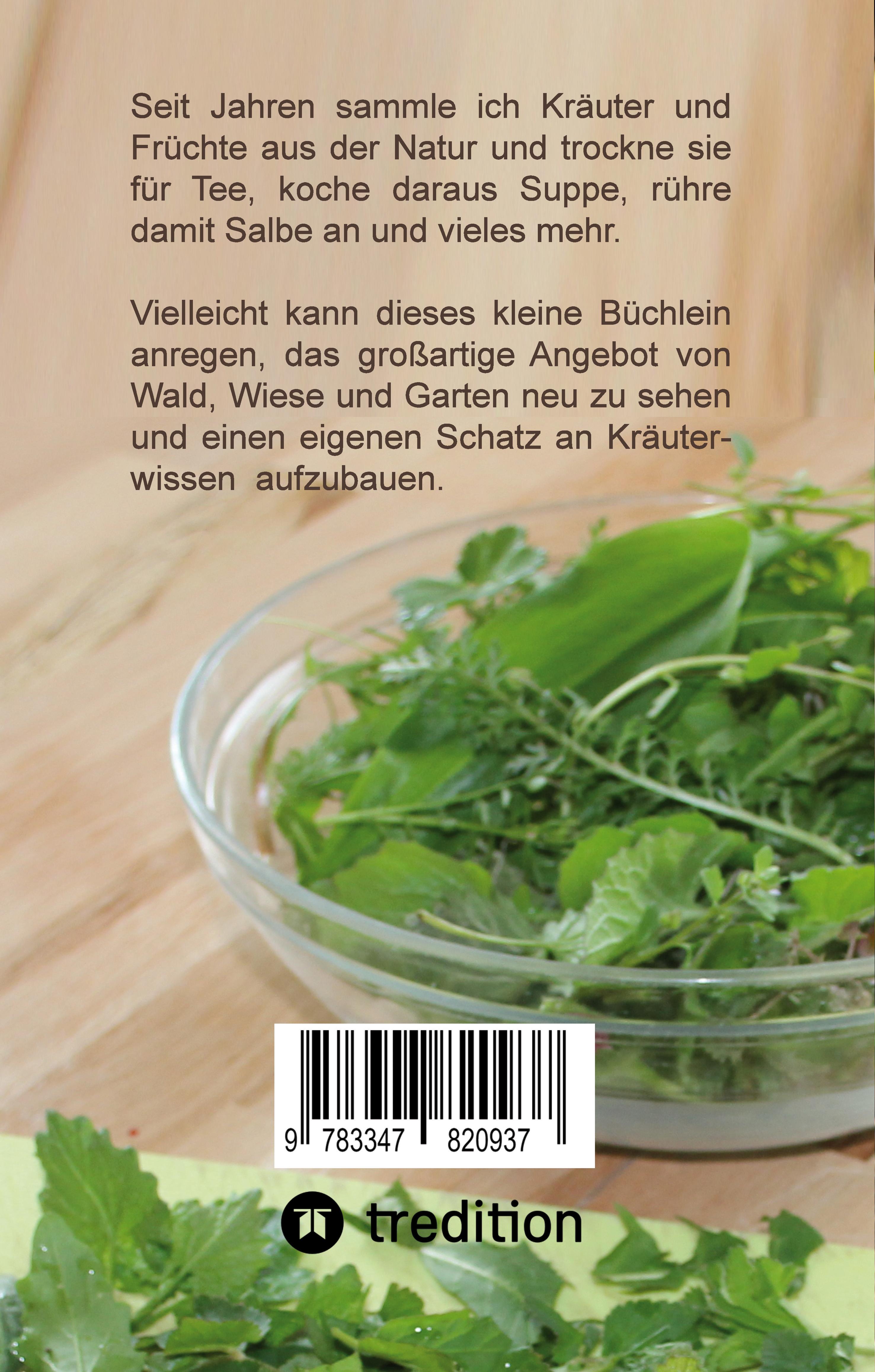 Hinaus in die Natur mit Korb und Schere! Vieles, was Du findest, ist essbar.Kräuter enthalten einen Reichtum an Vitaminen, Bitterstoffen, ätherischen Ölen und mehr. Schnibble daraus einen Salalt oder ein Pesto, koche Tee, trockne die Kräuter für Duftkissen oder rühre Salbe an. Wie das geht? Helga Harter gibt Anregungen, Rezepte und Sammelhinweise.Es ist nicht schwer!