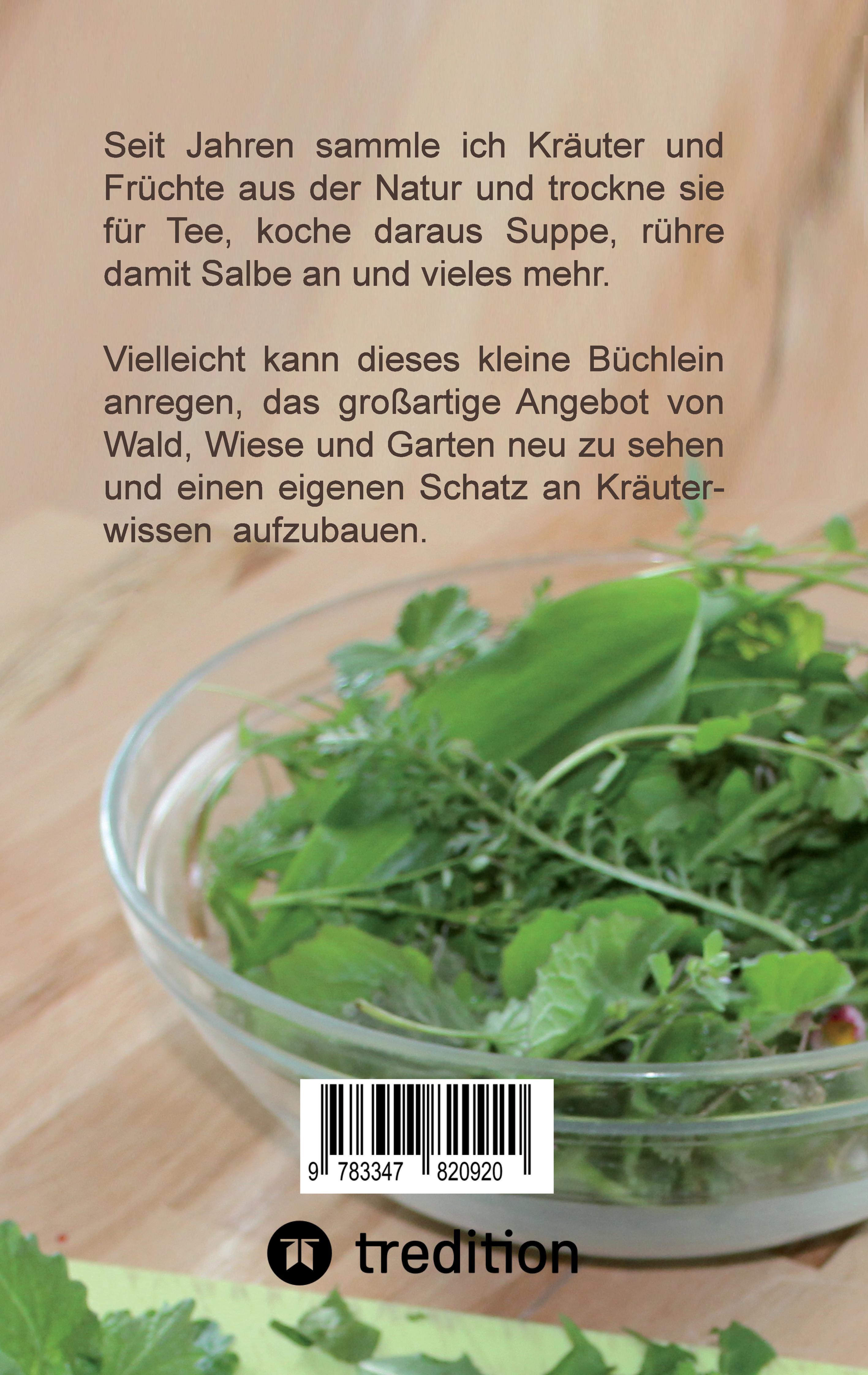 Hinaus in die Natur mit Korb und Schere! Vieles, was Du findest, ist essbar.Kräuter enthalten einen Reichtum an Vitaminen, Bitterstoffen, ätherischen Ölen und mehr. Schnibble daraus einen Salalt oder ein Pesto, koche Tee, trockne die Kräuter für Duftkissen oder rühre Salbe an. Wie das geht? Helga Harter gibt Anregungen, Rezepte und Sammelhinweise.Es ist nicht schwer!