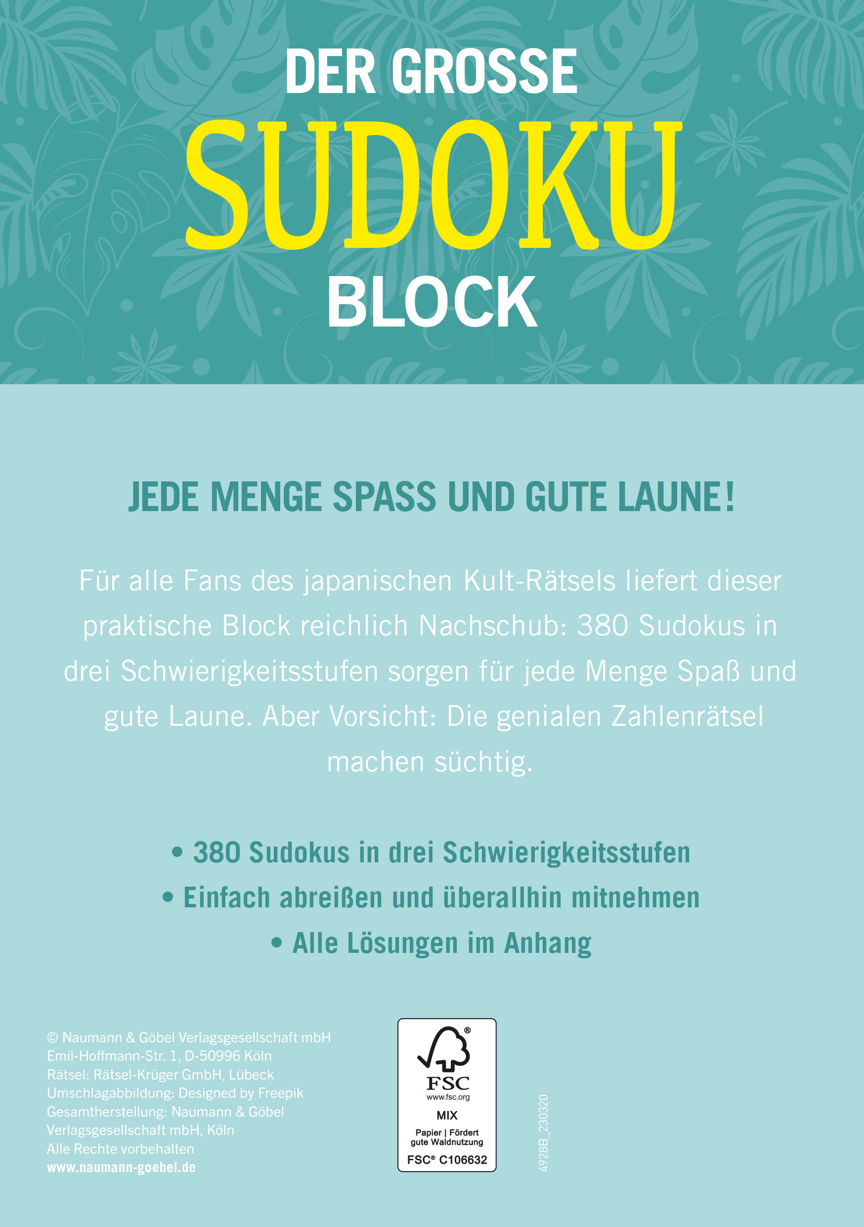 Genial einfach und doch verflixt schwierig - Sudoku ist ein Knobelspaß der Sonderklasse. Hier kommt reichlich Nachschub für alle Sudoku-Fans: 380 knifflige Herausforderungen lauern in unserem neuen Großen Sudoku-Block 7 auf Sie. Mit den drei Schwierigkeitsstufen in aufsteigender Reihenfolge können Sie Ihre Sudoku-Skills testen und nach und nach verbessern. Dabei lässt sich die tägliche Rätsel-Portion aus dem praktischen Block ganz einfach herausreißen und überallhin mitnehmen. So können Sie Ihrer Rätsel-Leidenschaft immer und überall nachgehen. Und mit Kombinationsgabe, Konzentrationsfähigkeit und Ausdauer werden Sie im Handumdrehen zum wahren Sudoku-Meister. Aber Vorsicht: Die genialen Zahlenrätsel machen süchtig.