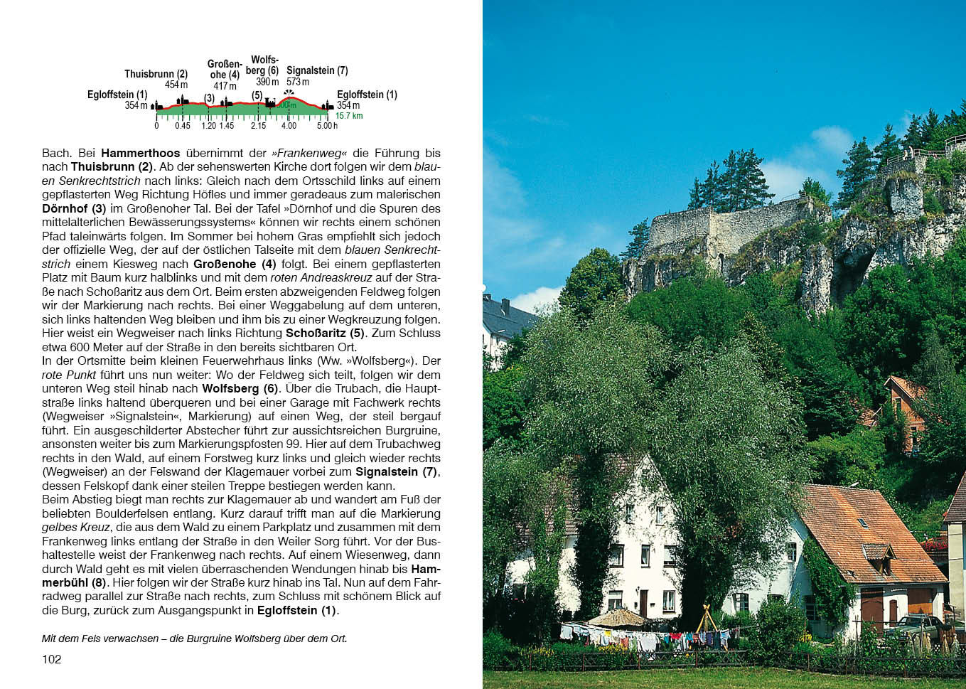 Die Auswahl der Touren reicht von kurzen Wanderungen bis zu ausgedehnten Tagesunternehmungen. Bei vielen Touren gibt es Extra-Vorschläge für gemütliche, kurze Spaziergänge. In engen Tälern wandert man an munter dahinplätschernden Flüssen und Bächen entlang, an denen zum Teil noch alte Mühlen klappern. Aus bewaldeten Hängen schimmern hell und hoch die Felsen. Und in kleinen Fachwerkdörfchen lädt nach der Wanderung das nächste Dorfgasthaus, vielleicht sogar mit eigener Brauerei, zu einer kräftigen Brotzeit und einem typisch süffigen fränkischen Landbier ein. Romantisch und liebenswert - so gibt sich das Frankenjura!