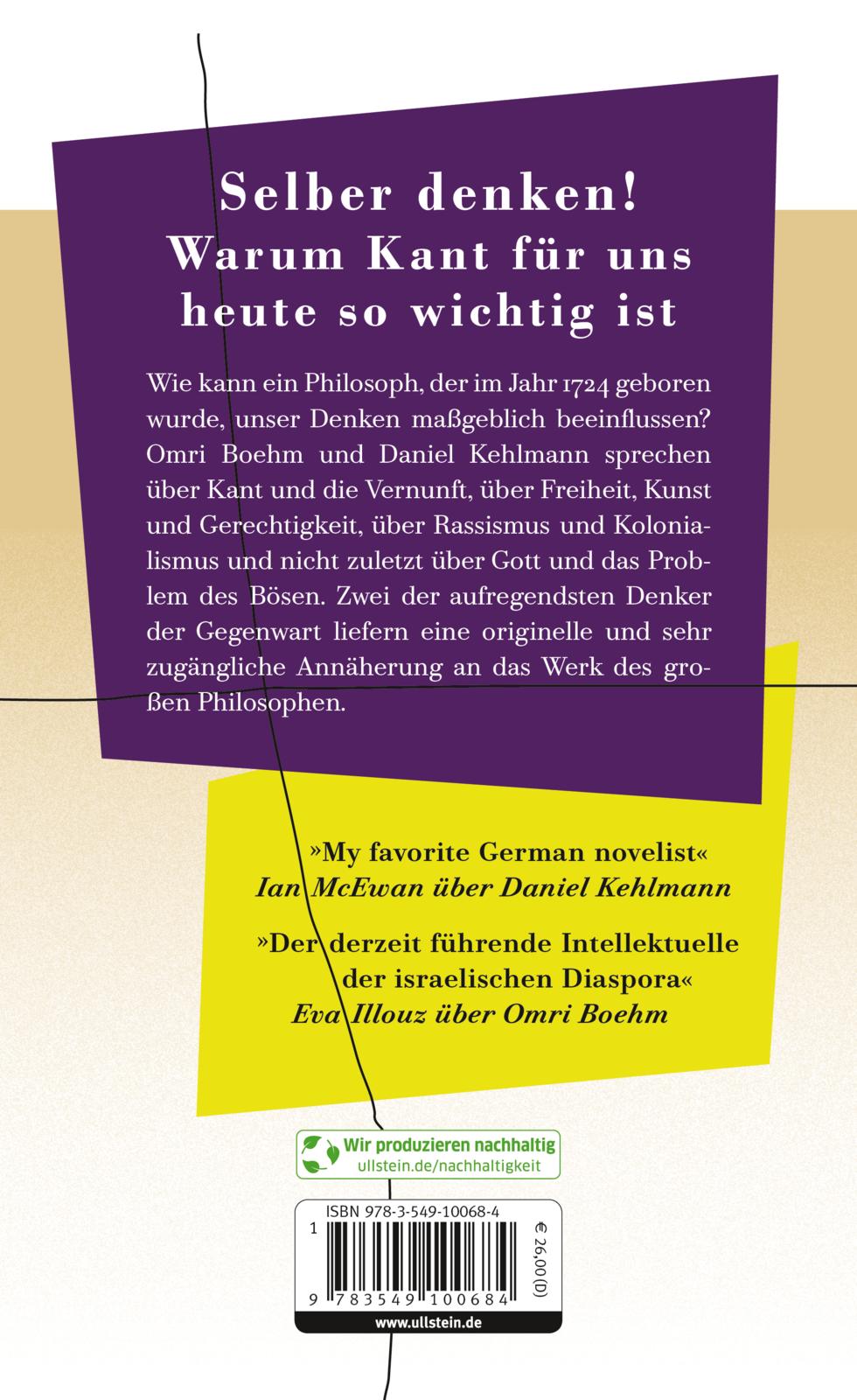 Alle wichtigen Themen kommen zur Sprache: von Vernunft und Illusion bis zu Rassismus, Kolonialismus und Aufklärung; von Raum und Zeit bis zu Freiheit, Kunst, Gerechtigkeit und dem Problem des Bösen; von der Wissenschaft bis zum Glauben, vom Selbst bis zu Gott. Omri Boehm und Daniel Kehlmann behandeln Kant als Zeitgenossen, der uns heute noch wichtige Antworten auf aktuelle Fragen geben kann.