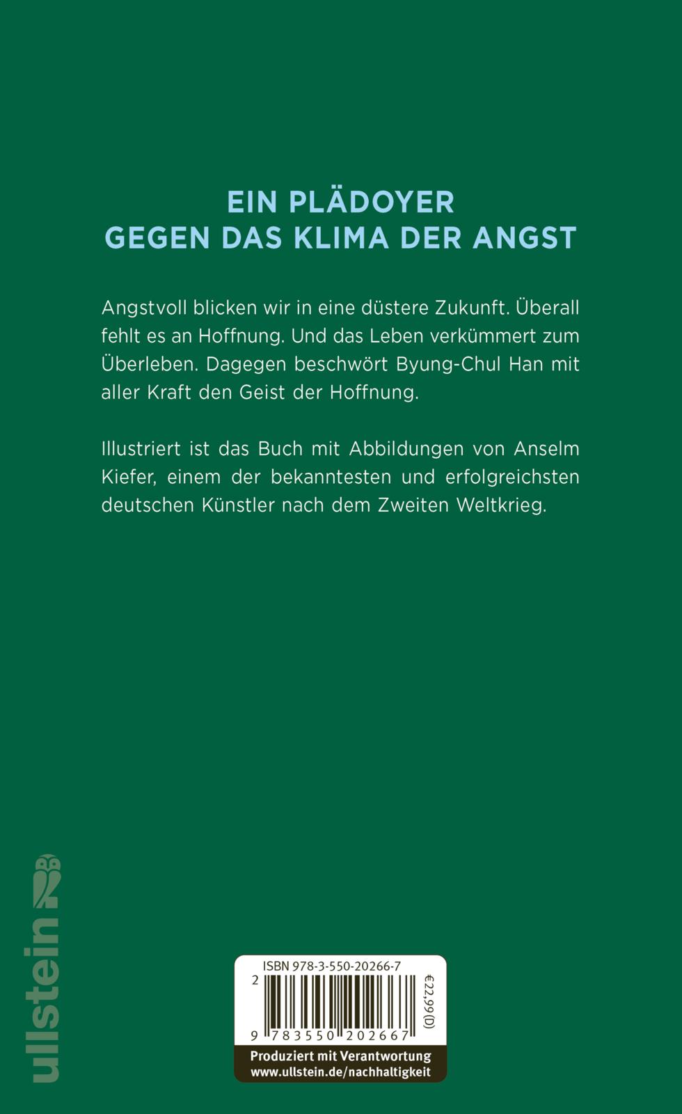 Seit geraumer Zeit werden wir permanent mit apokalyptischen Szenarien konfrontiert: Pandemie, Weltkrieg und Klimakatastrophe. Der Weltuntergang oder das Ende der menschlichen Zivilisation wird heraufbeschworen. Angst und Ressentiments aber schüren Egoismus und Hass – mit der Folge, dass in unserer Gesellschaft Solidarität, Freundlichkeit und Empathie erodieren und letztlich die Demokratie selbst gefährdet ist. Byung-Chul Han entwickelt gegen das Klima der Angst eine überzeugende Philosophie der Hoffnung, die über die gegenwärtige Krise hinaus Gültigkeit hat.