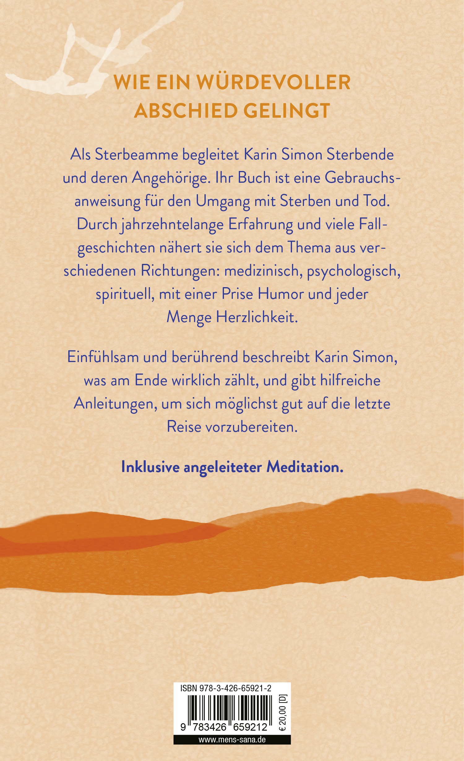 Wir haben Angst vor dem Tod. Nicht alle von uns, aber doch die meisten. Wäre es nicht beruhigend, eine Art Gebrauchsanweisung für das Sterben zu haben? Und einen lieben Menschen an der Seite, der keine Angst hat? Der dem Tod schon oft gegenüber gestanden ist und uns zeigen kann, wie ein friedvoller Abschied gelingt? Für die Psychotherapeutin HP, examinierte Krankenschwester und ausgebildete Sterbe- und Traueramme Karin Simon ist der Tod nicht furchteinflößend; sie hat ihn oft gesehen und viele Hände sterbender Menschen gehalten.