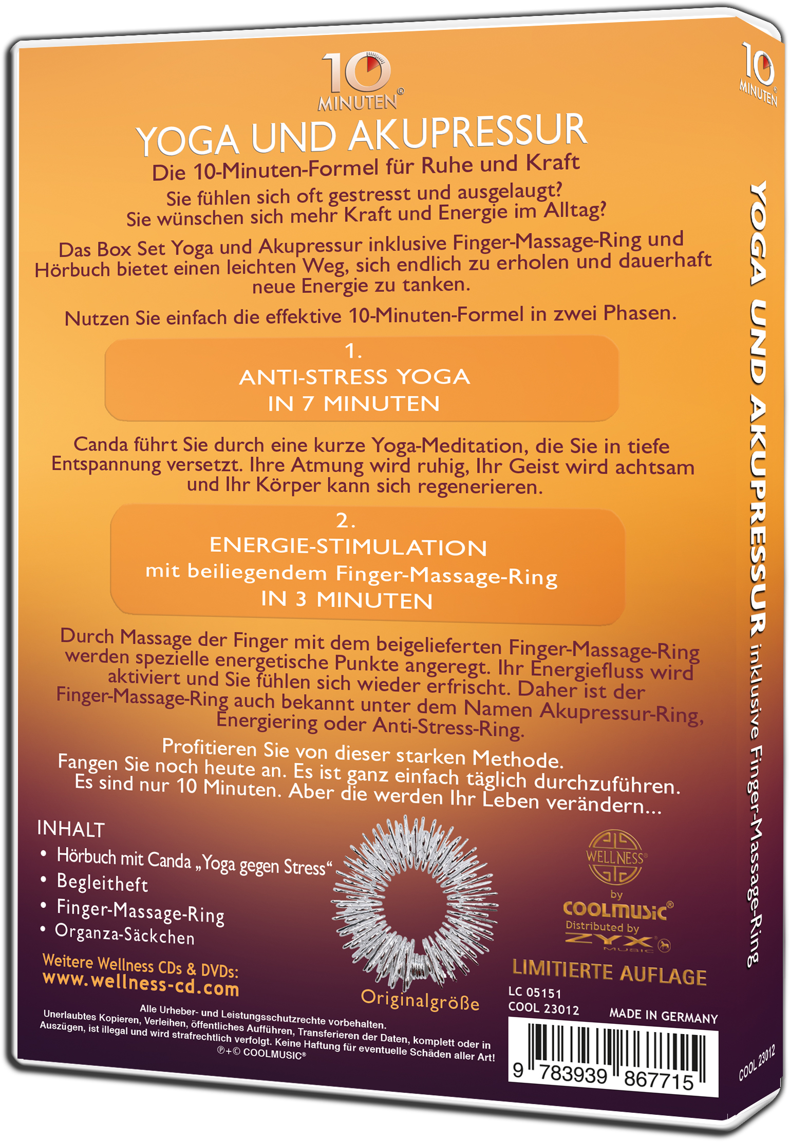 Das Yoga und Akupressur Box Set enthält das Hörbuch mit Anleitungsheft "Yoga gegen Stress" und einen Finger-Massage-Ring zur Akupressur. Das Set bietet damit einen leichten Weg, sich in 10 Minuten zu erholen und neue Energie zu tanken.