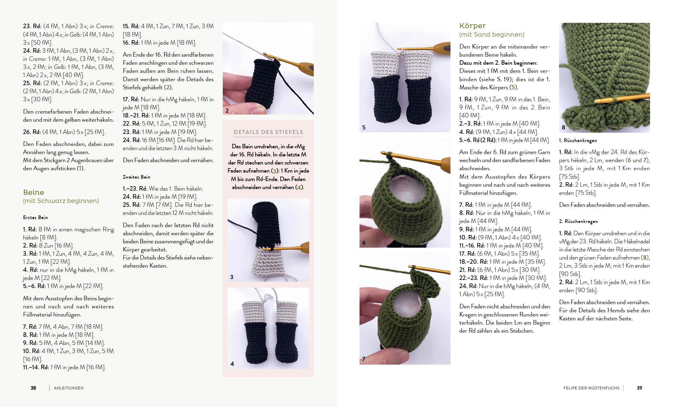 Nach einer Einführung in Materialien und verschiedene Häkeltechniken inklusive Illustrationen folgen schon die einzelnen Anleitungen für die frechen Häkelfiguren. Jedes der Tiere hat einen ganz eigenen Charakter und bringt eine Geschichte mit, die es förmlich lebendig werden lässt. Maße und Materialangaben sind den durchfotografierten Anleitungen beigefügt, so kann nichts schiefgehen. Jetzt steht dem Häkeln der mit Liebe zum Detail entworfenen Amigurumis nichts mehr im Wege!