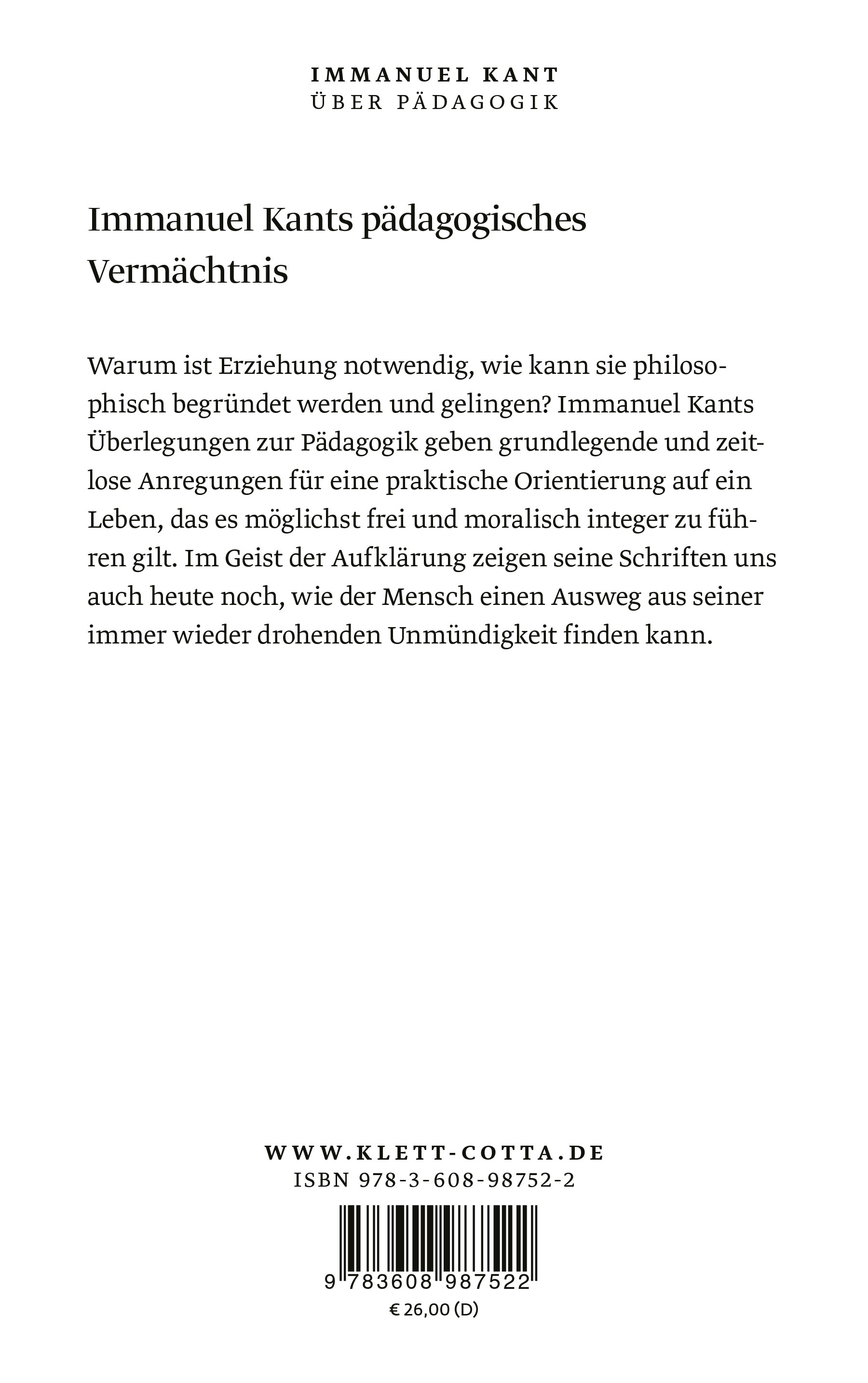 Immanuel Kant (1724–1804), einer der größten Philosophen der europäischen Kulturgeschichte, dachte auch über das Gelingen einer guten Erziehung nach. Dabei begab er sich auf die Suche nach einer Pädagogik, die der »Bestimmung« des Menschen entspricht: nämlich ein vernünftiges, freiheitsliebendes und moralisch empfindsames Lebewesen sein zu können. Diese Eigenarten des Menschen sind nur eine Anlage, die sich nicht instinktgeleitet entwickelt. Sie muss zielgerichtet entfaltet werden. Der Mensch muss erzogen werden, wobei die Dreiheit von Vernunft, Freiheit und Moral von vornherein eine zwangsweise Abrichtung verbietet. Wie Kant den pädagogischen Prozess gedacht hat, um das verwirklichen zu können, was er für das Wesen des Menschen bestimmt hatte, ist für uns noch heute von ungebrochener Aktualität.