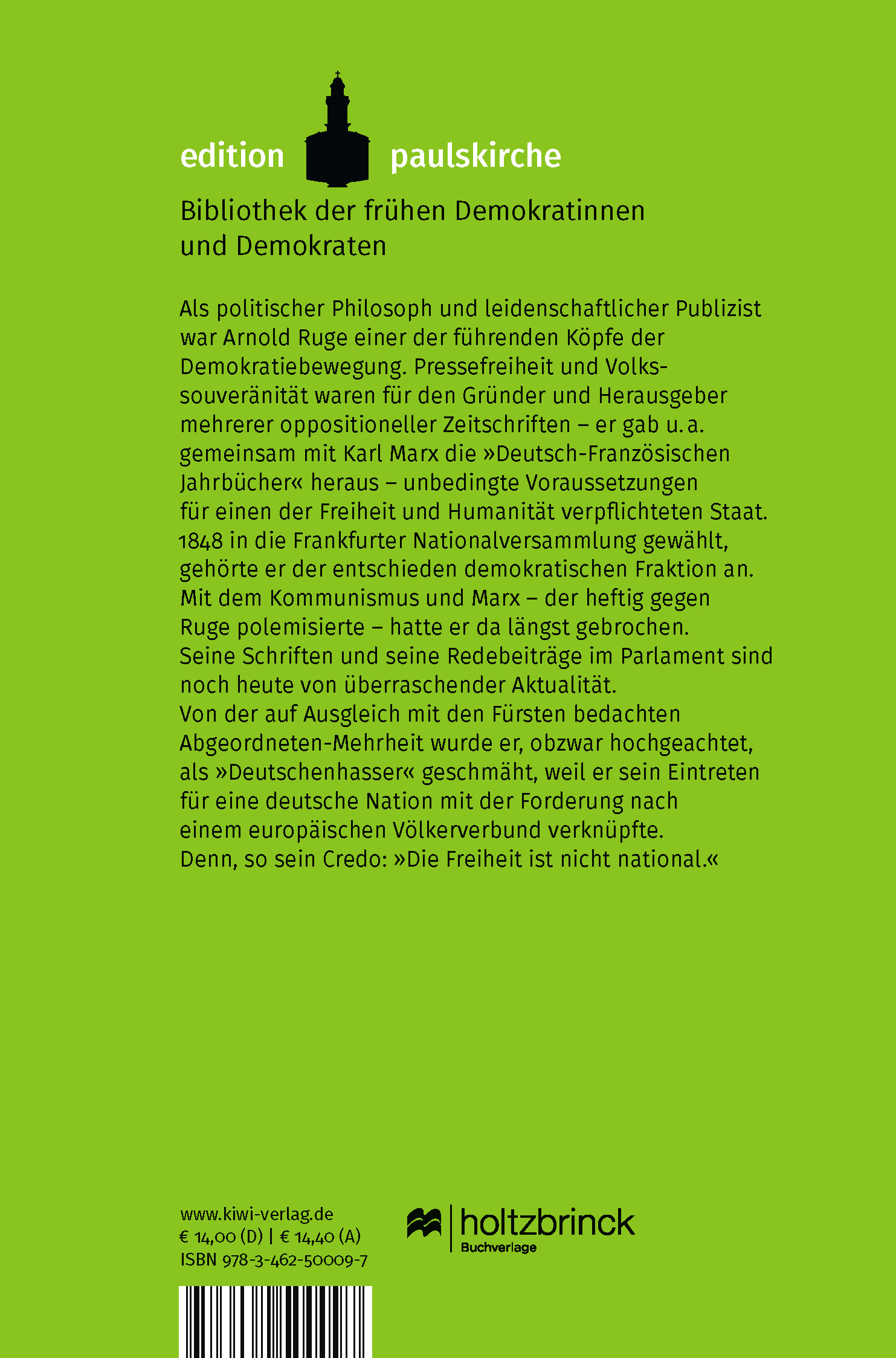 Als politischer Philosoph und leidenschaftlicher Publizist war Arnold Ruge einer der führenden Köpfe der Demokratiebewegung. Pressefreiheit und Volkssouveränität waren für den Gründer und Herausgeber mehrerer oppositioneller Zeitschriften - er gab u. a. gemeinsam mit Karl Marx die "Deutsch-Französischen Jahrbücher" heraus - unbedingte Voraussetzungen für einen der Freiheit und Humanität verpflichteten Staat. 1848 für Breslau in die Frankfurter Nationalversammlung gewählt, gehörte er der entschieden demokratischen Fraktion des "Donnersberg" an. Mit dem Kommunismus und Marx, der heftig gegen Ruge polemisierte - hatte er da längst gebrochen.