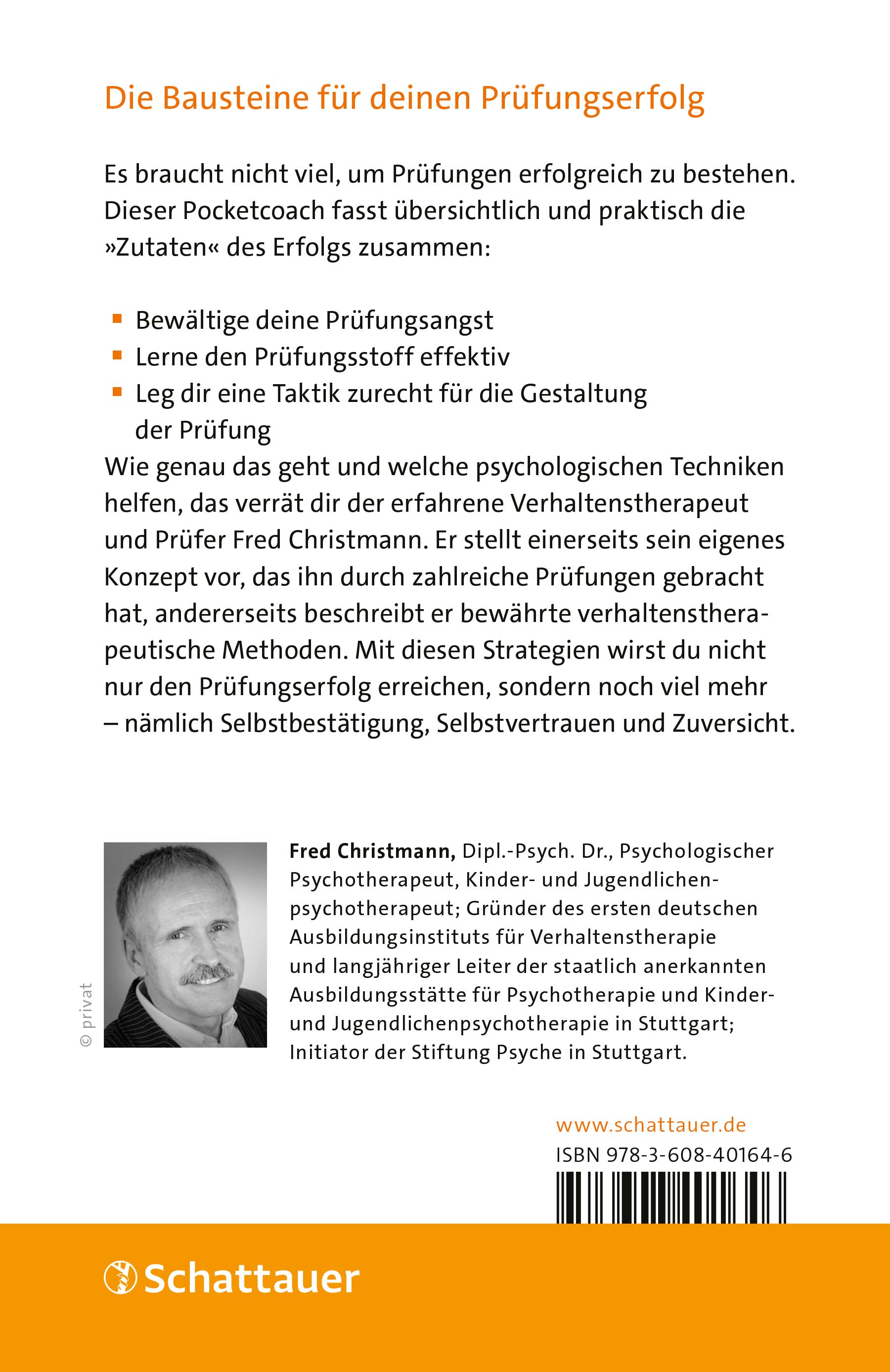 Wie genau das geht und welche psychologischen Techniken helfen, das verrät dir der erfahrene Verhaltenstherapeut und Prüfer Fred Christmann. Er stellt einerseits sein eigenes Konzept vor, das ihn durch zahlreiche Prüfungen gebracht hat, andererseits beschreibt er bewährte verhaltenstherapeutische Methoden. Mit diesen Strategien wirst du nicht nur den Prüfungserfolg erreichen, sondern noch viel mehr - nämlich Selbstbestätigung, Selbstvertrauen und Zuversicht.