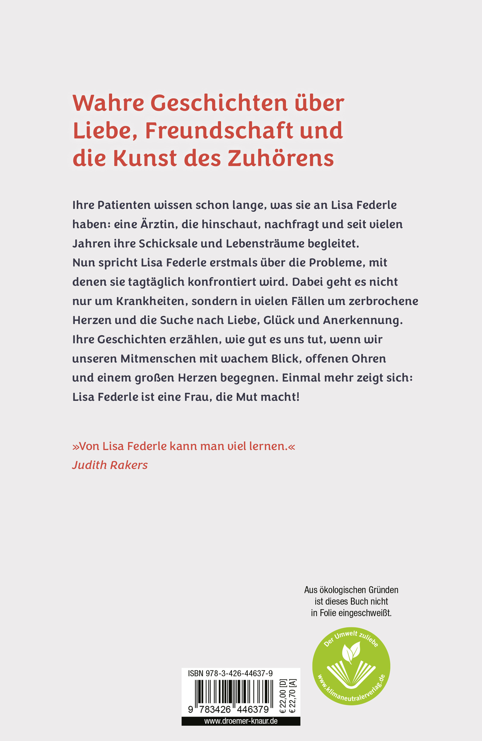 In ihrem neuen Buch spricht Lisa Federle über die Probleme, mit denen sie täglich konfrontiert wird. Dazu gehören Einsamkeit, Demenz, Angst, Depression, von den psychosomatischen Folgen persönlicher Krisen ganz zu schweigen. Nicht selten aber sind auch Liebesbeziehungen Ursache für gesundheitliche Krisen - und die Scham, darüber zu sprechen, ist bei den Betroffenen groß. Denn allzu oft geht es um Dinge, die über das persönliche Schicksal hinaus auch gesellschaftliche Fragen betreffen.