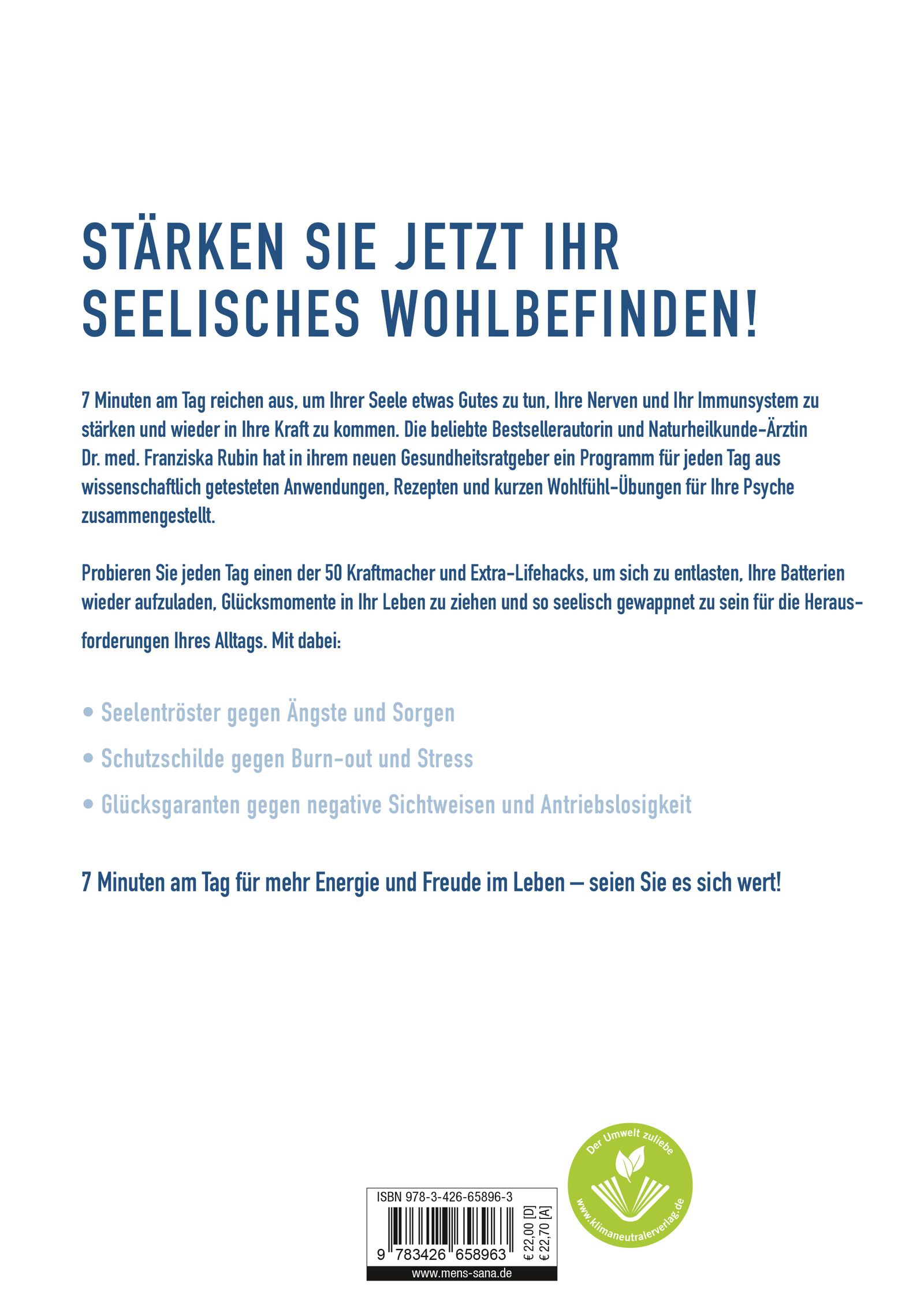 7 Minuten am Tag reichen aus, damit Sie ab sofort stressfreier, entspannter und zufriedener leben. Die Bestsellerautorin und Ärztin Dr. med. Franziska Rubin hat in ihrem neuen Gesundheits-Ratgeber die besten wissenschaftlich gesicherten Methoden und Übungen aus den sieben wichtigsten Lebensstilbereichen zusammengetragen, die Ihre Psyche (wieder) stark machen.