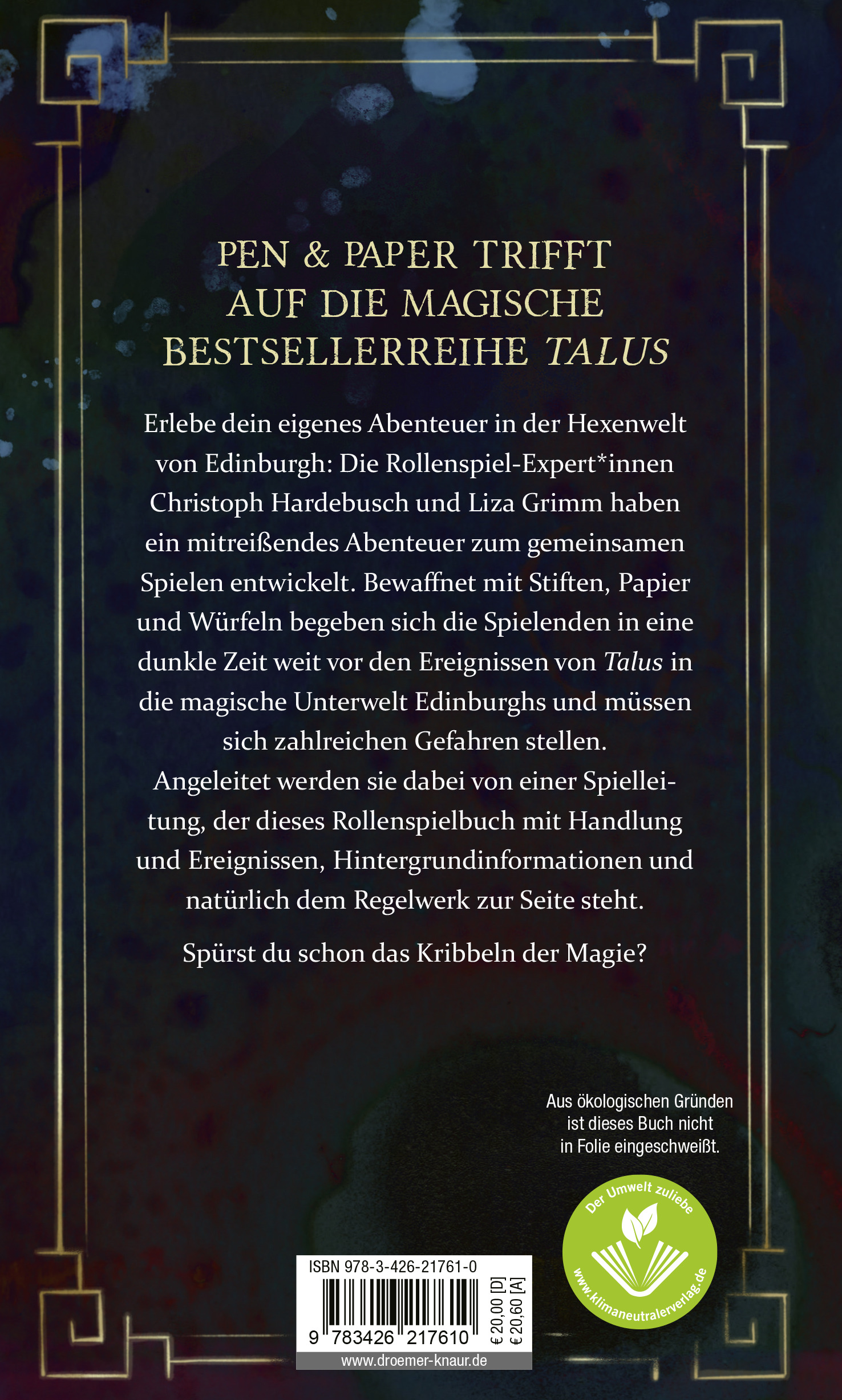 Jetzt können alle Fans der Fantasy-Bestsellerreihe »Talus« ihr eigenes Abenteuer in der Hexenwelt von Edinburgh erleben: Angelehnt an bekannte Pen-&-Paper-Rollenspiele (z. B. Dungeons & Dragons, Das schwarze Auge) haben Liza Grimm und Christoph Hardebusch ein klassisches Adventure zum gemeinsamen Spielen entwickelt. Bewaffnet mit Stiften, Papier und Würfeln begeben sich die Spieler*innen in einer dunklen Zeit weit vor den Ereignissen von Talus in die magische Unterwelt Edinburghs und müssen zahlreiche Quests bestehen. Angeleitet werden sie dabei von einem/einer Spielleiter*in, dem/der das Rollenspielbuch mit Handlung und Ereignissen, Hintergrundinformationen und natürlich dem Regelwerk zur Seite steht.