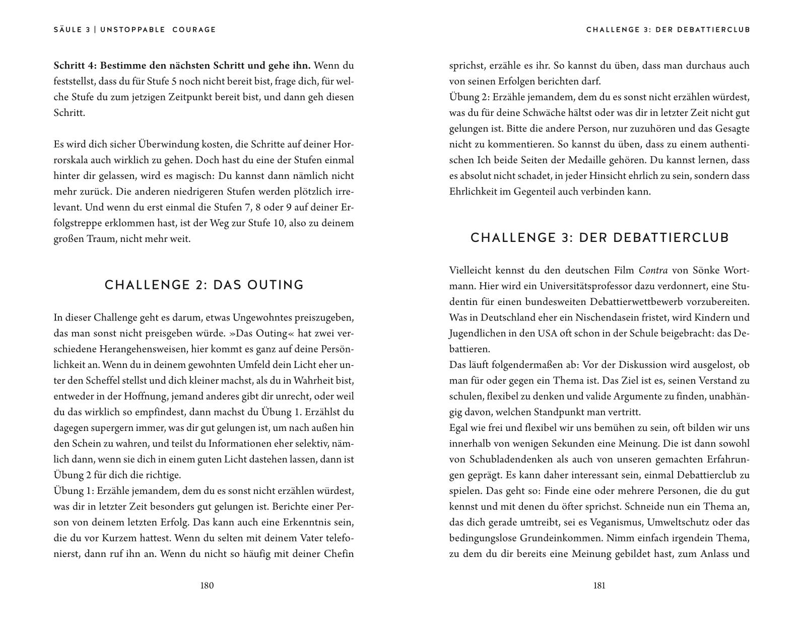 Ein unerschütterliches Selbstvertrauen ist für Frauen auch heute noch keine Selbstverständlichkeit. Drei Säulen zeigen dir, wie du mutig dein Wunschleben kreieren kannst: 1. Klarheit: Erlebe, wer du wirklich bist und was du dir, unabhängig vom Umfeld, wirklich wünschst. Die weltbekannte Selbstcoachingmethode "The Work" nach Byron Katie hilft dir, limitierende Glaubenssätze aufzulösen und selbstbewusst deinen Platz im Leben einzunehmen. 2. Energie: Kurze Power-Übungen steigern dein Energieniveau und beeinflussen somit dein Auftreten, Charisma und deine Präsenz positiv. 3. Challenges: Mit spannenden Challenges bringst du das Gelernte in den Alltag und trainierst so den Mut, deine eigene Wahrheit zu leben. So wirst du UNSTOPPABLE.