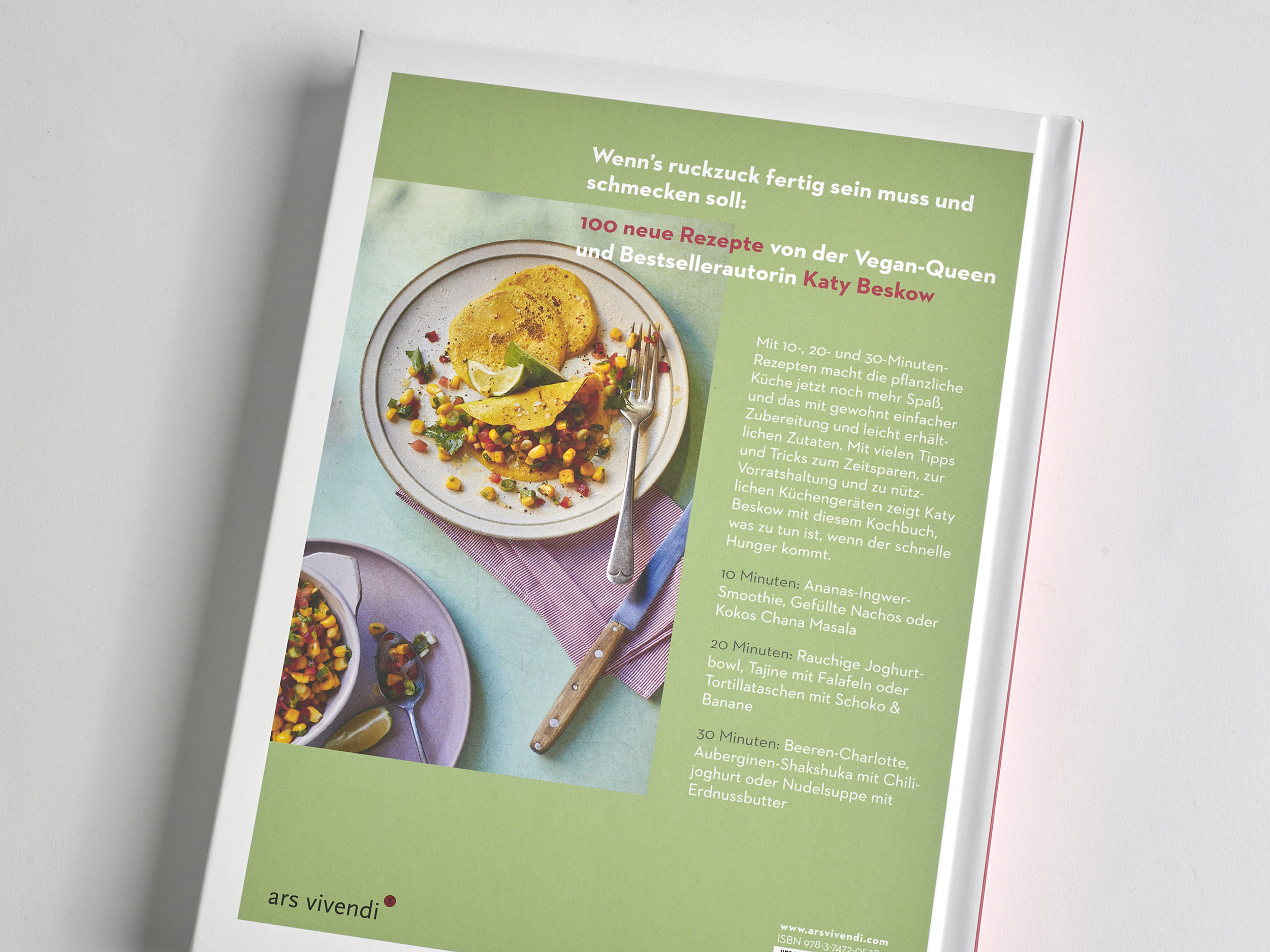 Wer denkt, in zehn Minuten ließe sich keine vegane Mahlzeit zaubern, der kennt Katy Beskow nicht. Die Vegan-Queen zeigt mit ihrem neuen veganen Kochbuch, dass genau das möglich ist. In drei Kapiteln 10, 20 und 30 Minuten präsentiert sie gewohnt unkomplizierte fleischlose Rezepte mit den einfachsten Zutaten. Bevor sie jedoch zum Kochlöffel greift, verrät sie ihre besten Tipps und Tricks zum Zeitsparen sowie zur veganen Vorratshaltung in Kühlschrank und Speisekammer.