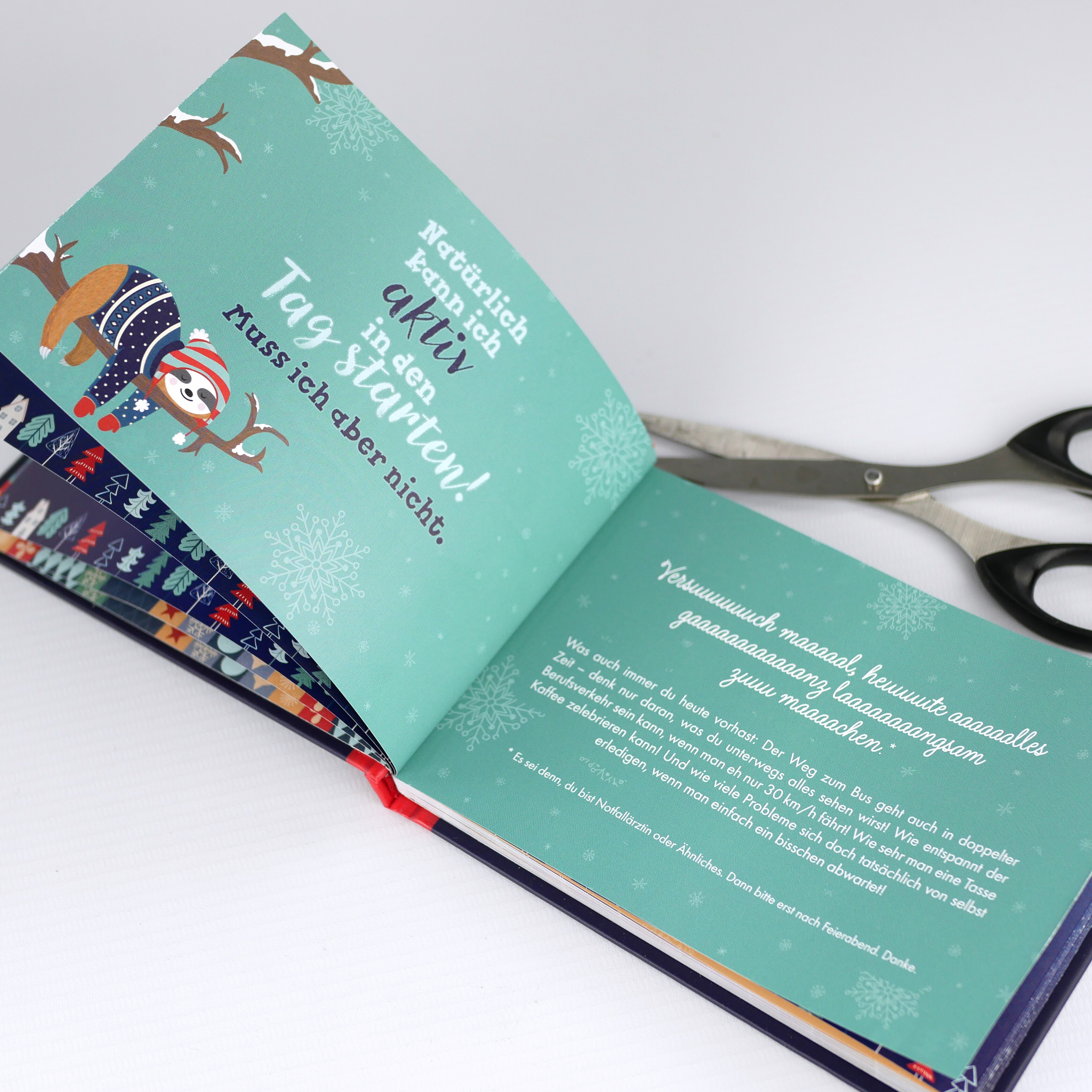 Sich die Lieblingsplätzchen gönnen, einen gemütlichen Tag voll Nichtstun oder einen Film dem Buch vorziehen das sind nur einige Tipps des Faultiers. Der Gelassenheitsmeister höchstpersönlich zeigt dir in diesem Adventskalender mit viel Witz und Humor, wie du in der Weihnachtszeit ohne schlechtes Gewissen entspannt bleibst. Schluss mit der Einkaufshetzerei, dem Plätzchenback-Marathon und anstrengenden Familienzusammenkünften.