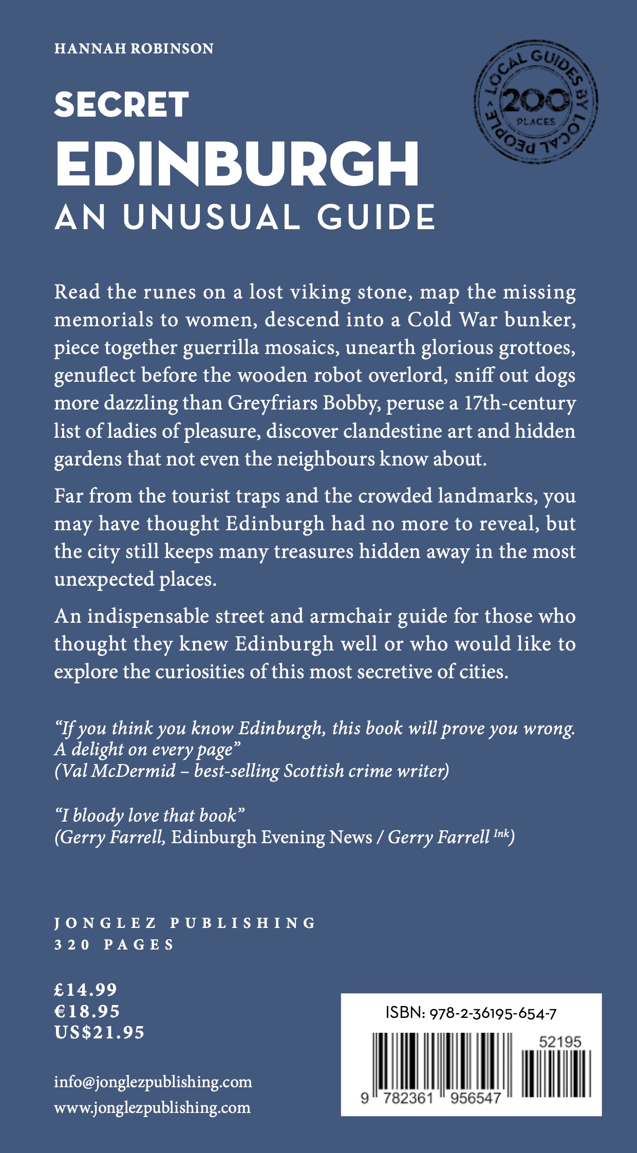"Most visitors only scratch the surface of the cities they visit. Most residents accidentally take for granted the places they live. This book delves deep into Edinburgh's rich history and the stories its special places tell, nudging its reader to find delight in the esoteric details, and to go and explore our wonderful and beautiful city with fresh eyes, a spring in the step and song in the soul."